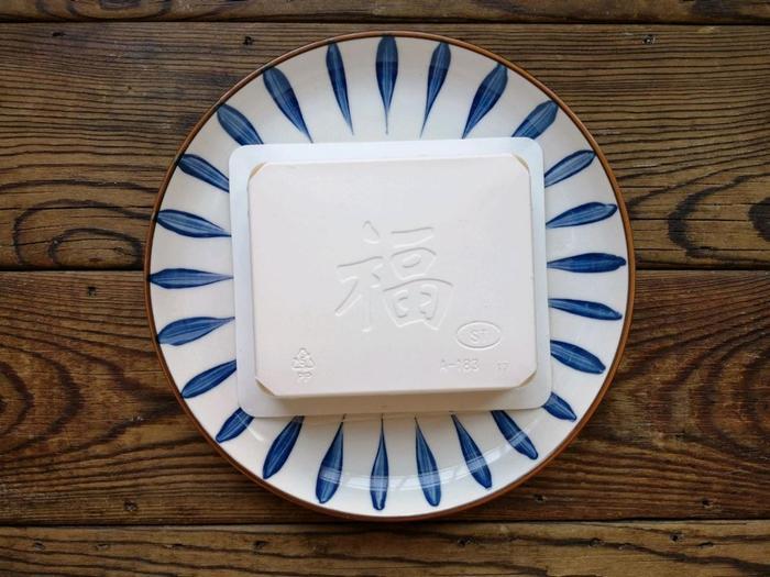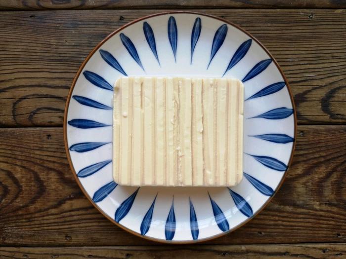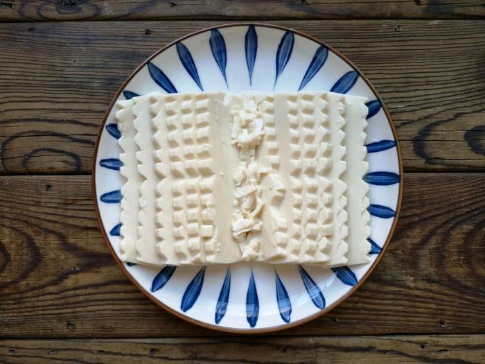 3、大豆腐准备一盒,将大豆腐从盒中完整的取出来,扣在盘子上;