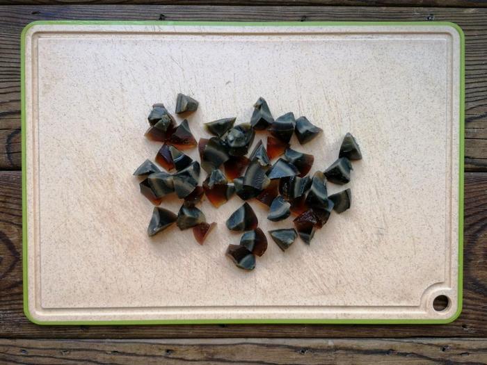 2、皮蛋去掉皮蛋壳之后切成指甲大小的小块;