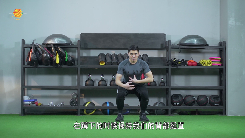 双脚自然分开,在蹲下时保持背部挺直,起来时有一个轻轻的小跳,同时异侧手的手掌摸到膝盖上方。