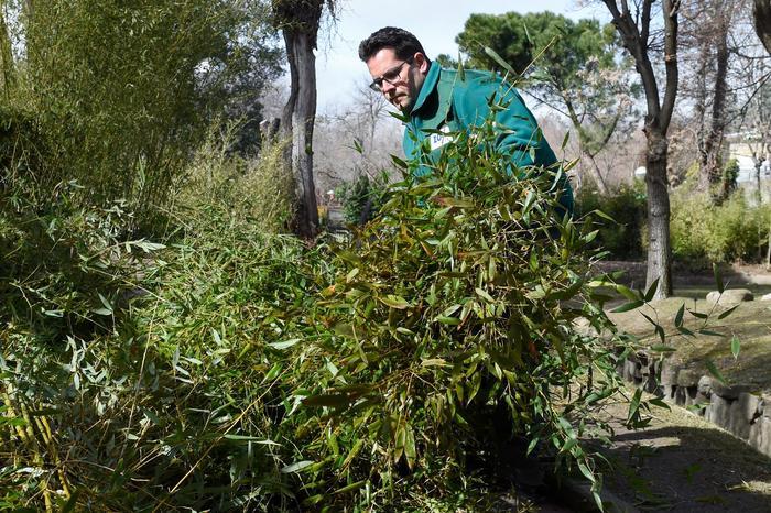 3月7日,大熊猫饲养员亚历杭德罗·卡布雷拉在西班牙马德里动物园工作。新华社发(古斯塔沃·巴连特摄)