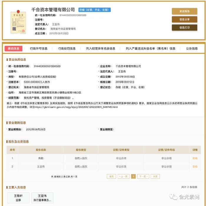 王亚伟的千合资本成立于2012年9月28日,注册资本5000万元,主要股东除王亚伟占股90%外,陶勤10%。主要高管除王亚伟是执行董事兼总经理外,公司监事为王敬轩。陶勤和王敬轩作为密切合作关系的关键人,参与了大量其他公司主体的运营。