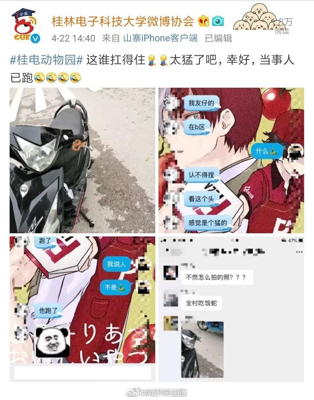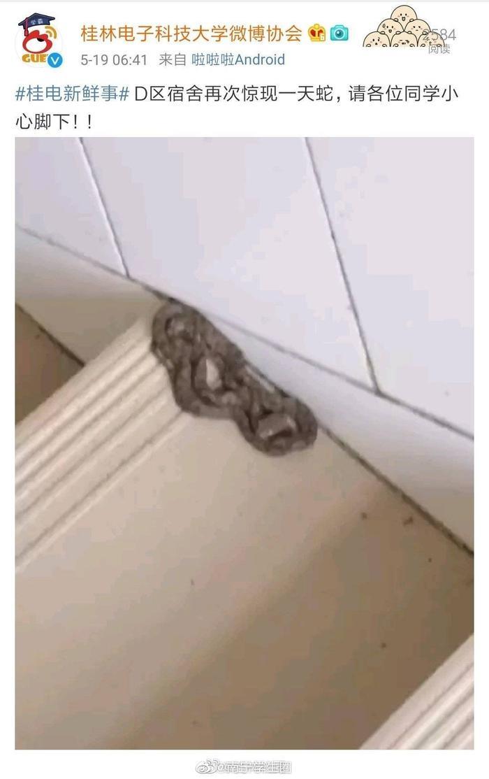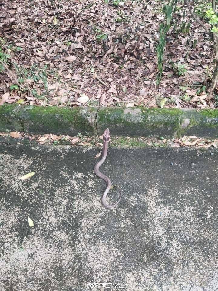 近日,@桂林电子科技大学 校园内经常有蛇出没,宿舍楼道里,电车上,草丛边,让人防不胜防。据图片校内出没的蛇为眼镜蛇腹蛇这种有毒蛇类,如被咬将危及生命安全。最近天气闷热适合蛇类活动,大家出行时一定要注意安全,夜晚少去黑暗的地方