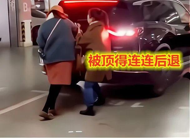 南京某商场地下停车场内,一女子和同伴 " 人肉占车位 ",对方强行开车进入车位,女子和同伴被车顶得连连后退,愤而报警。