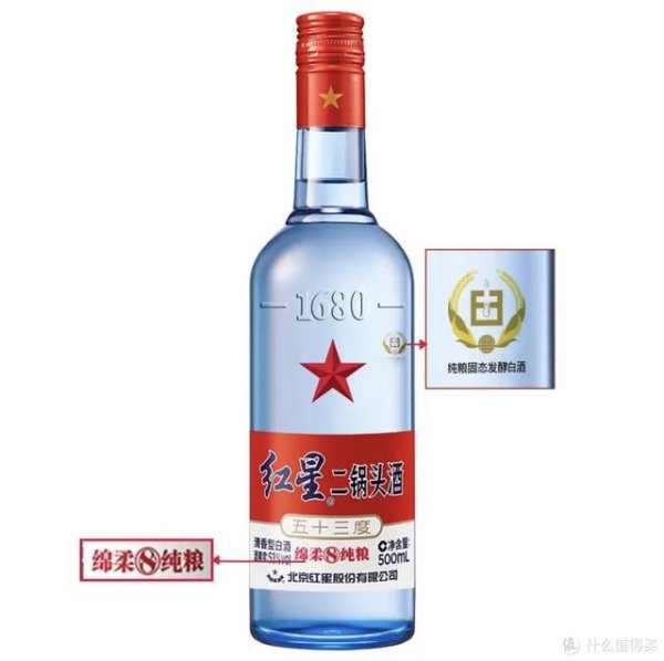 7、红星二锅头,一定要认准蓝瓶红星绵柔8,麸曲清香的代表,入口更为柔顺,而且价格相比其他品牌价格更便宜。