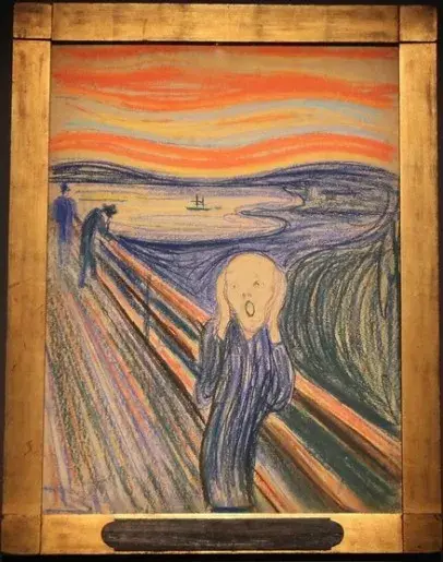这些出现在电视、广告、杂志、软件上的共同元素都来源于1893年挪威的表现主义艺术家爱德华·蒙克创作的《呐喊》,也有翻译为《尖叫》。当然,他跟我们鲁迅先生的《呐喊》所表达的是不一样。原画如下,它通常被认为是表现主义的代表作品,也有不少人认为它是仅次于《蒙娜丽莎》的世界第二伟大画作。