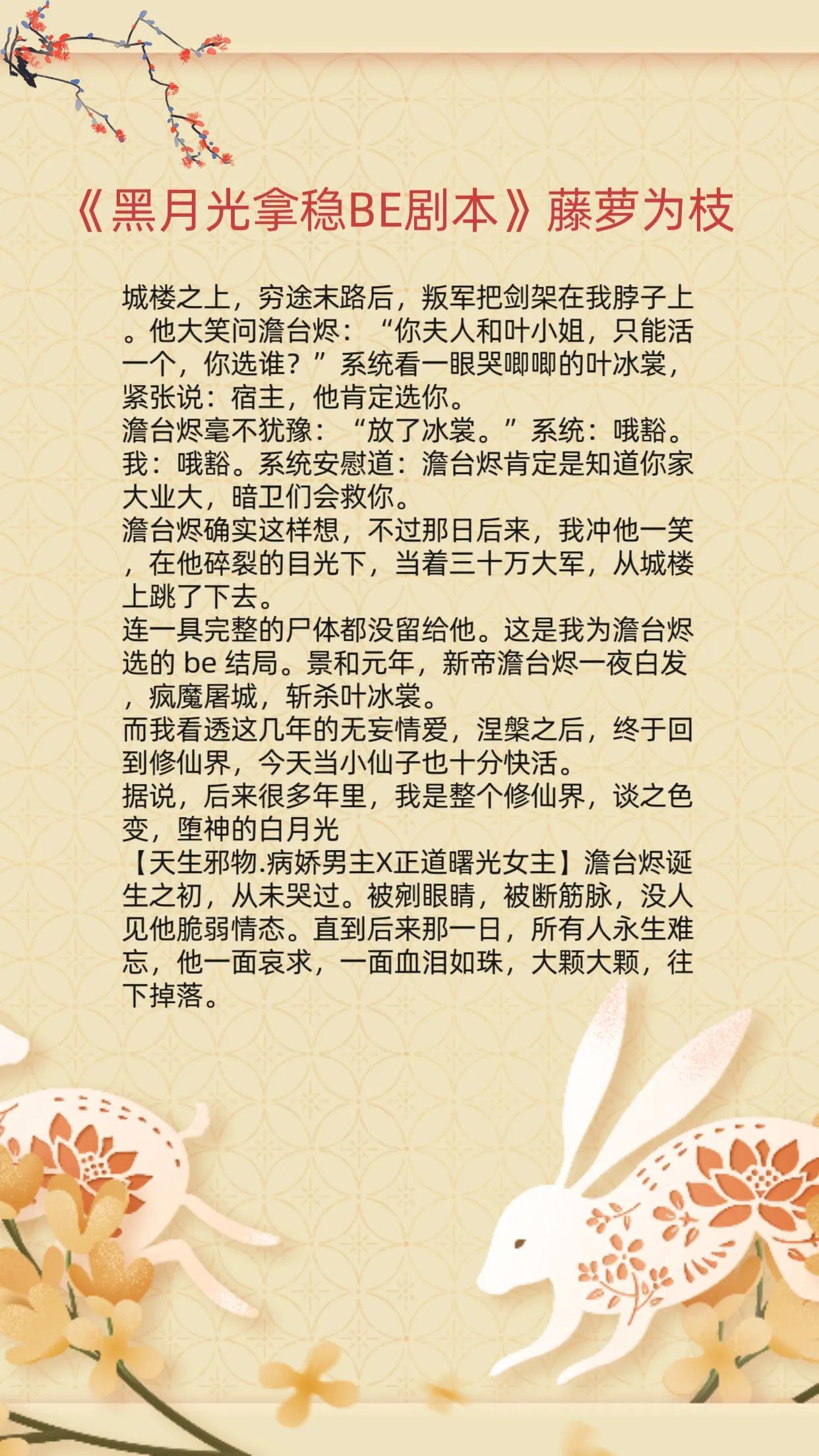 澹台烬以为黎苏苏是他这辈子唯一的希望,女主为了天下苍生亲手在他心上钉了六枚钉子,最终任务失败,被男主关在牢里折磨,两人相爱相杀,过程虽然虐心,但结局是好的。