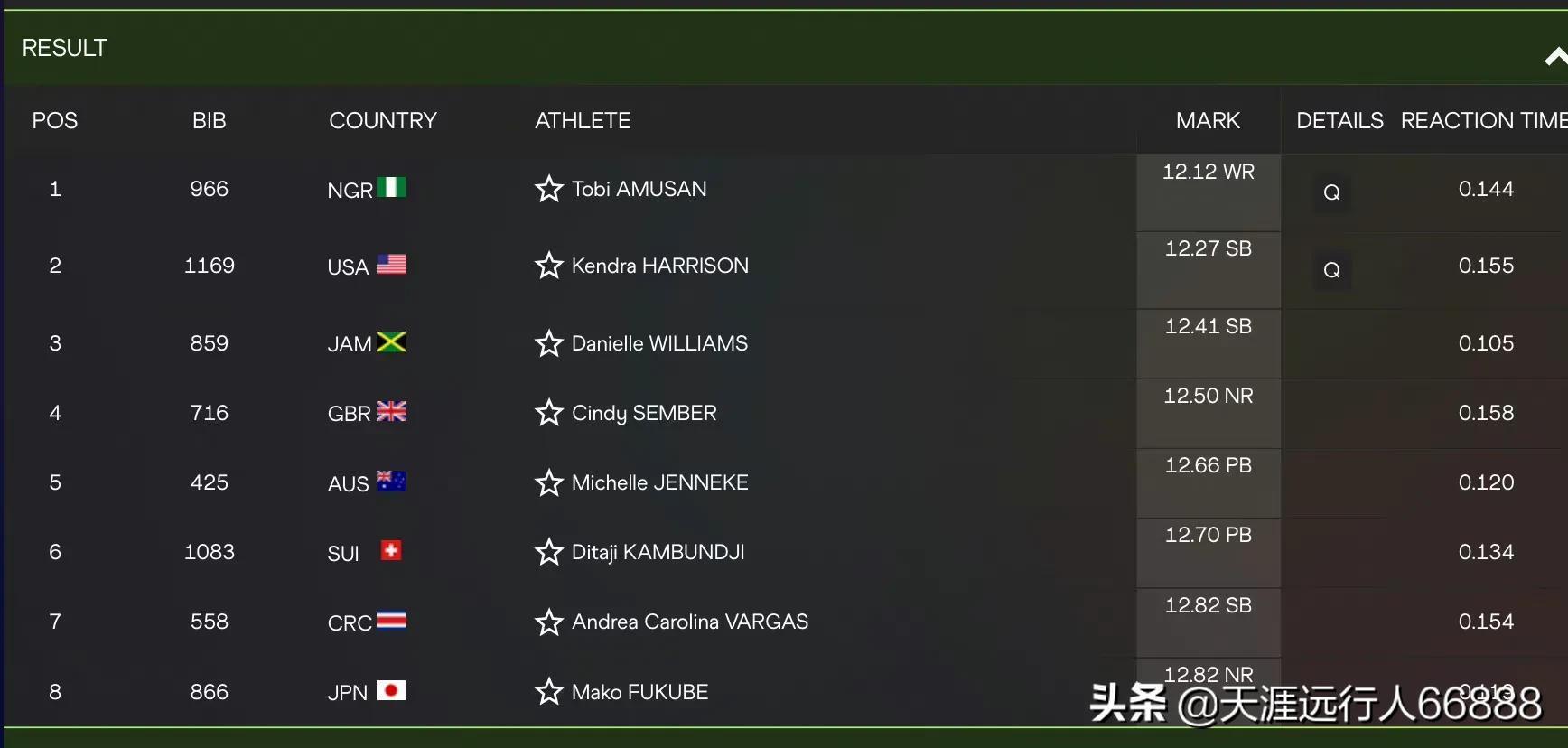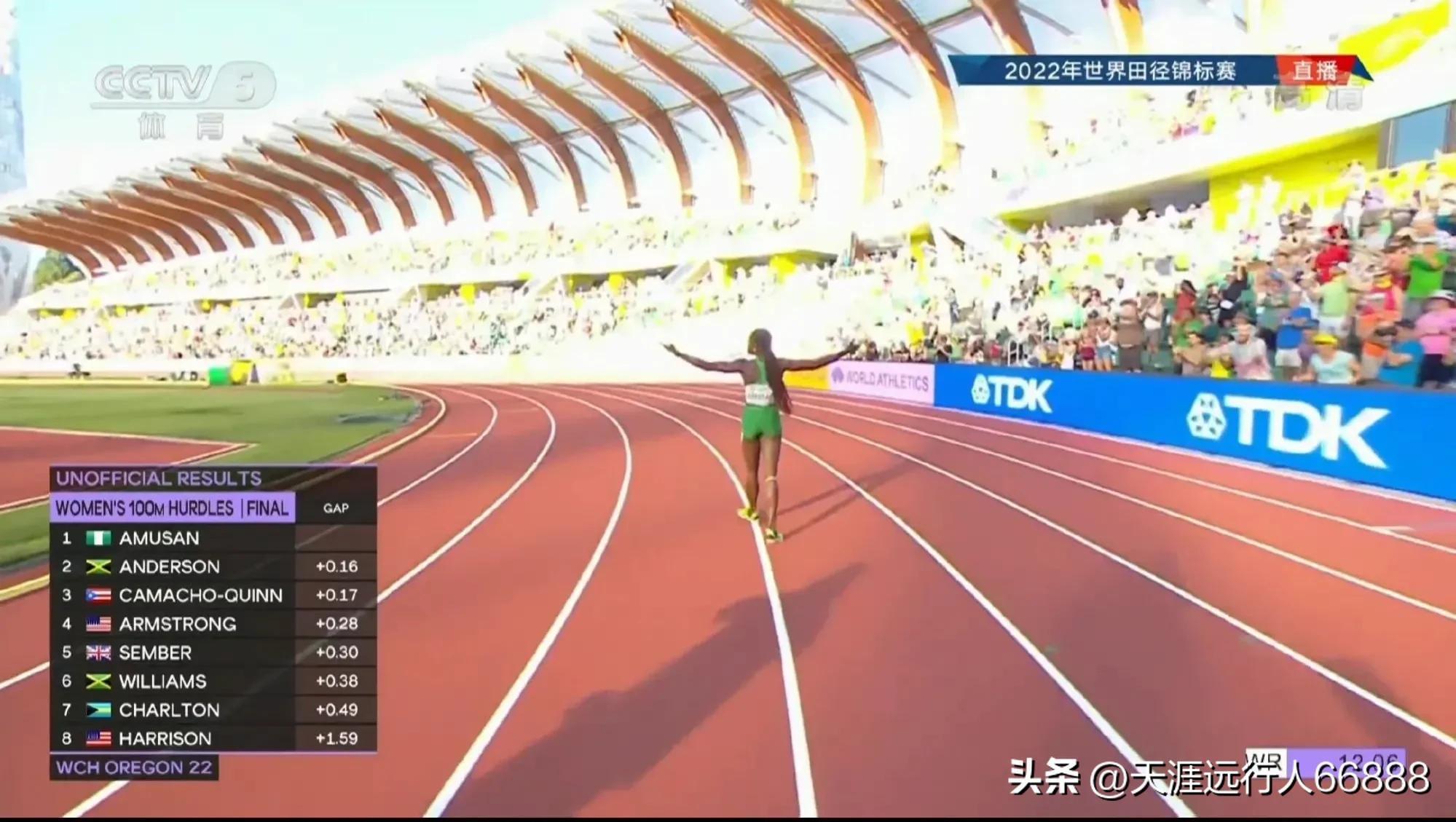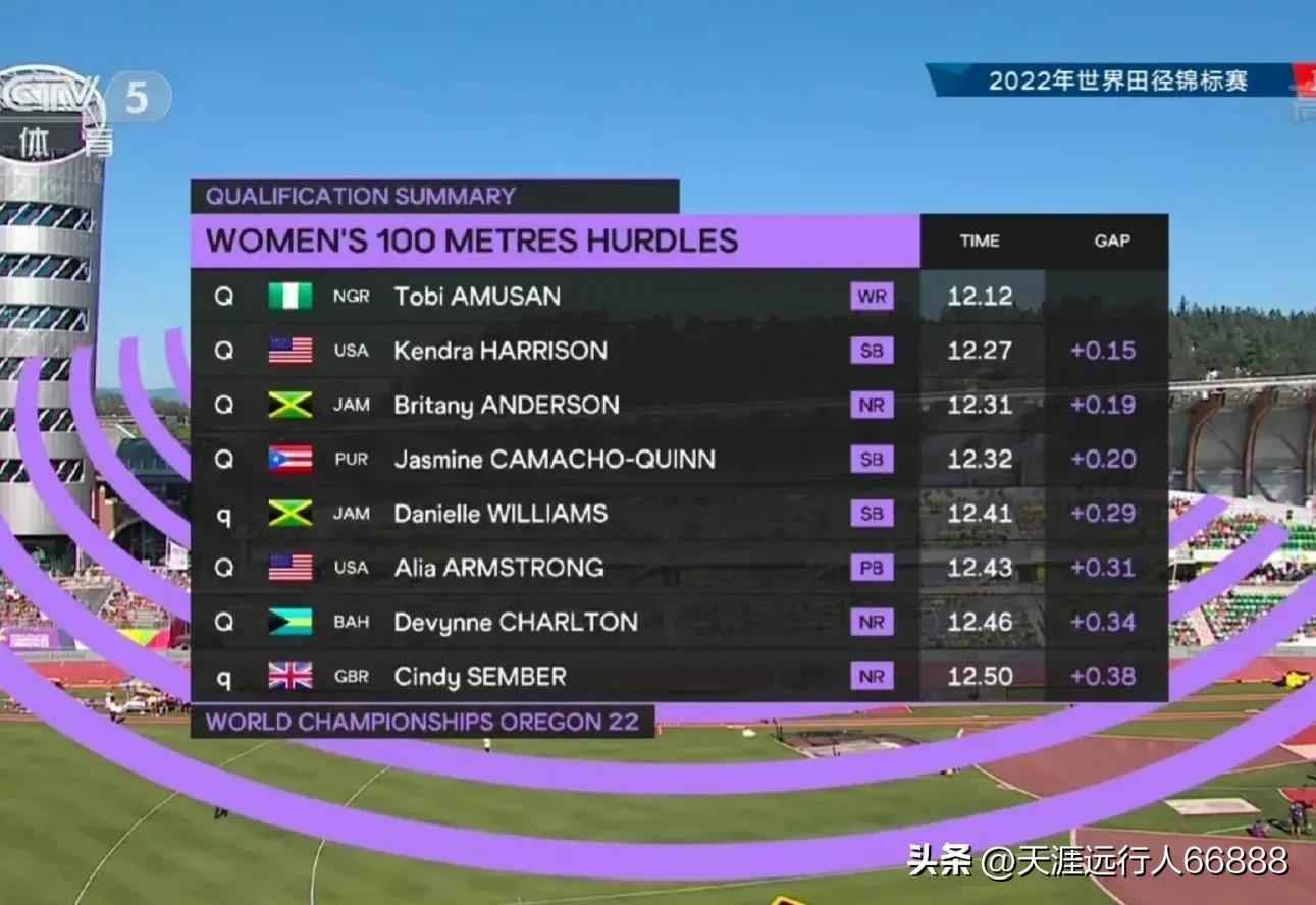 女子100米栏半决赛尼日利亚阿穆桑状态逆天,半决赛就把同组米国哈里森保持的12.20的世界记录给破了,这决赛你就大开脑洞想想吧!