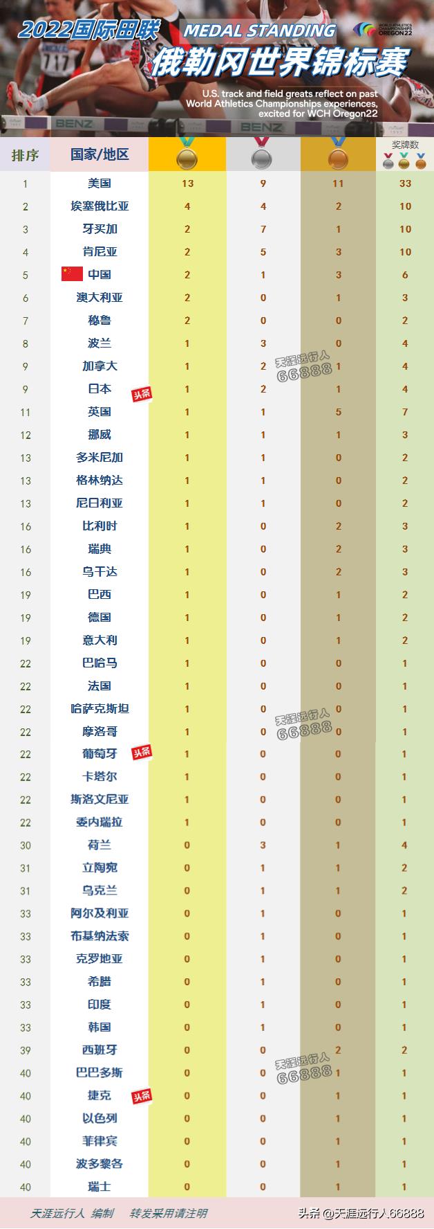 2022俄勒冈世锦赛最终金牌榜:
