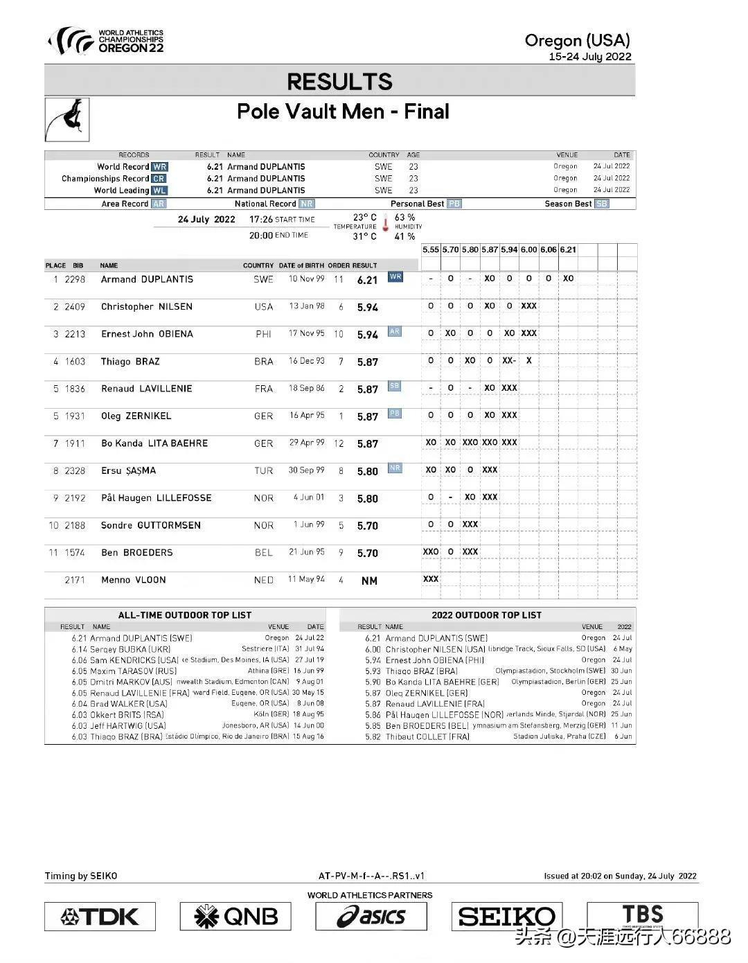 2022年俄勒冈世界田径锦标赛男子撑杆跳决赛,获得前三名的选手及成绩为: