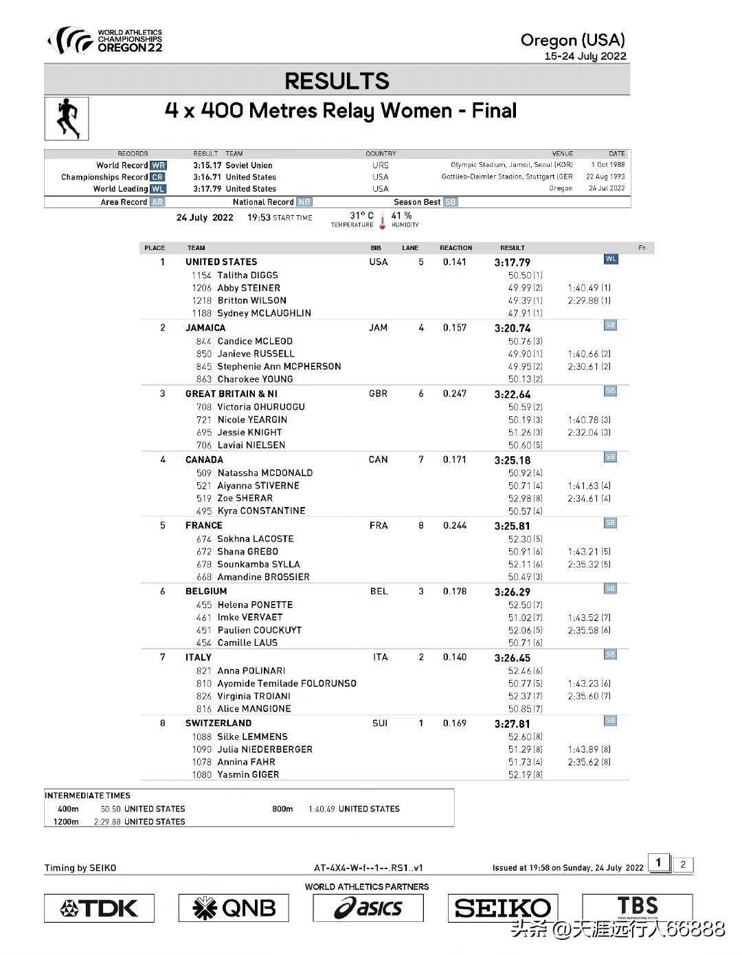 俄勒冈世界田径锦标赛女子4x400米决赛,获得金银铜牌的队伍及成绩: