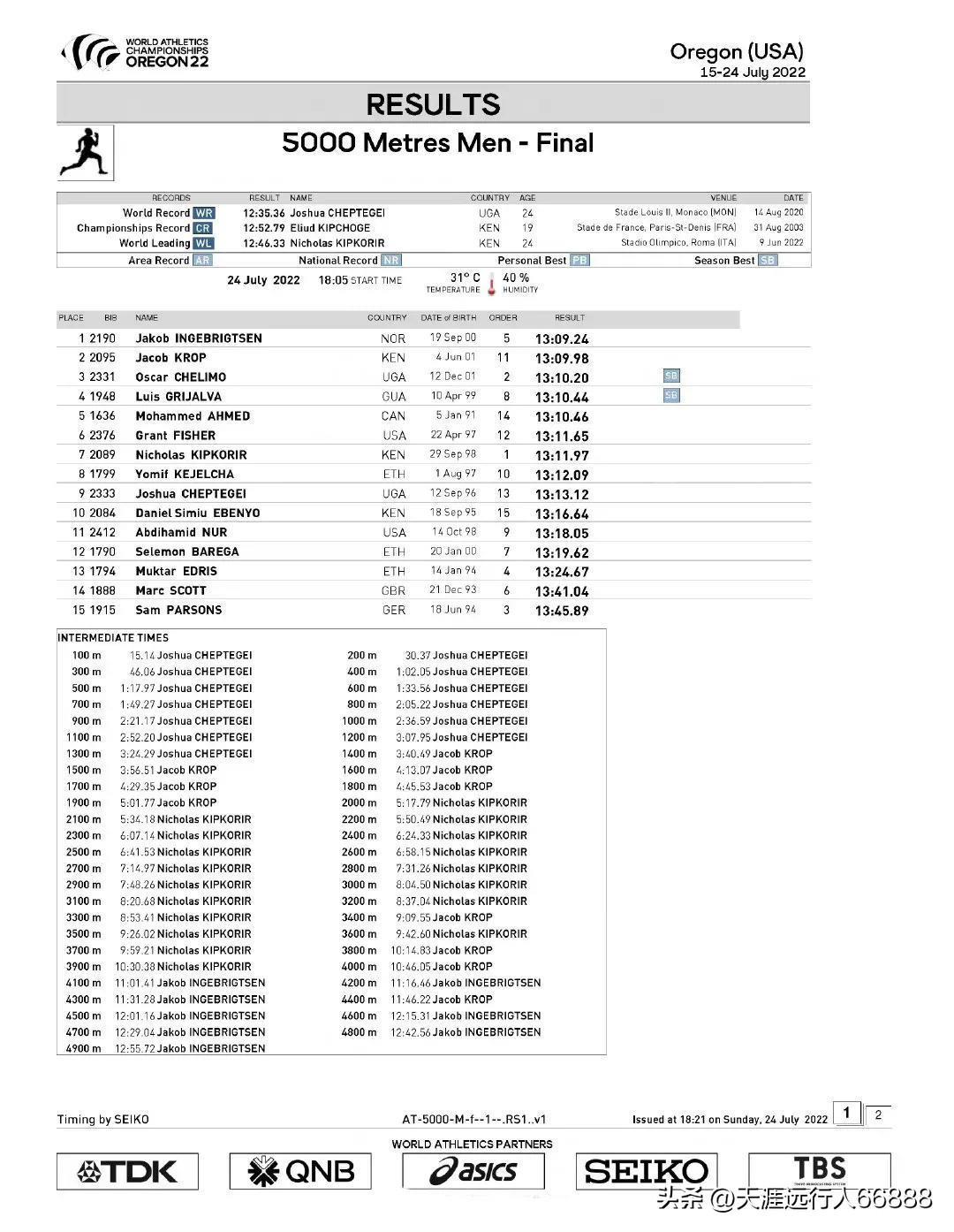 大热约书亚-切普特盖大失水准,仅仅以13:13.12名列第9名。东京奥运会冠军赛莱蒙·巴雷加更残,第12名3:19.62。秩序单里高手云集,这简直是神仙打架。