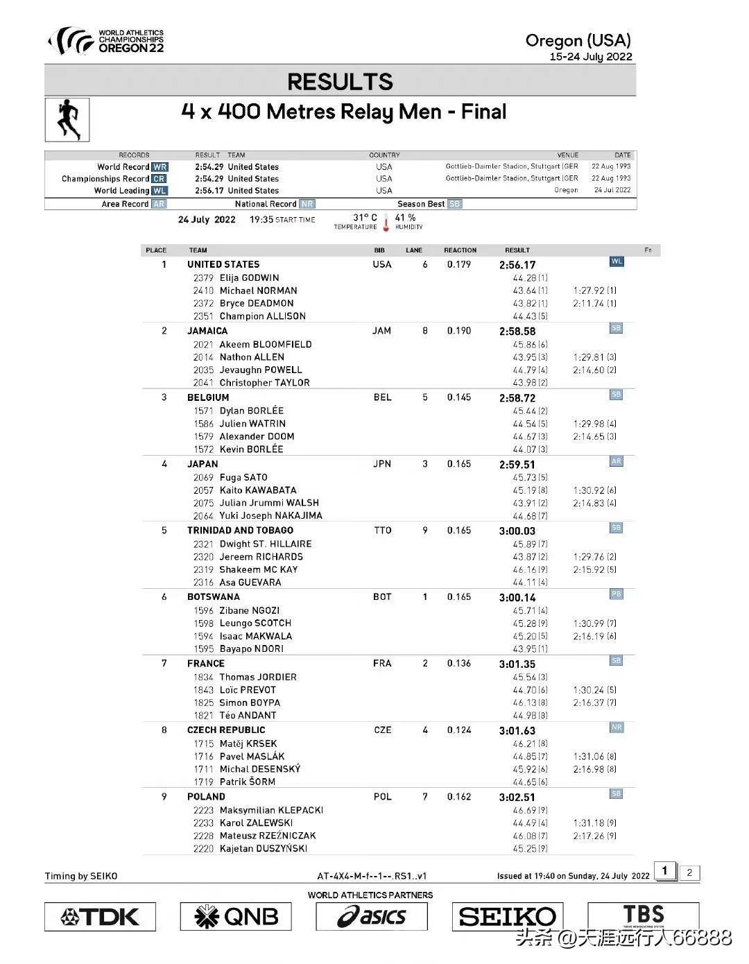俄勒冈世界田径锦标赛男子4x400米决赛,揽得金银铜牌的队伍和成绩: