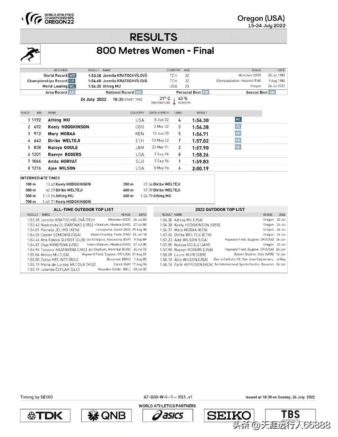 00后统治田径场800米赛道,女子800米决赛前三名全是00后 ,尤金世界田径锦标赛女子800米决赛,获得前三名的运动员及成绩: