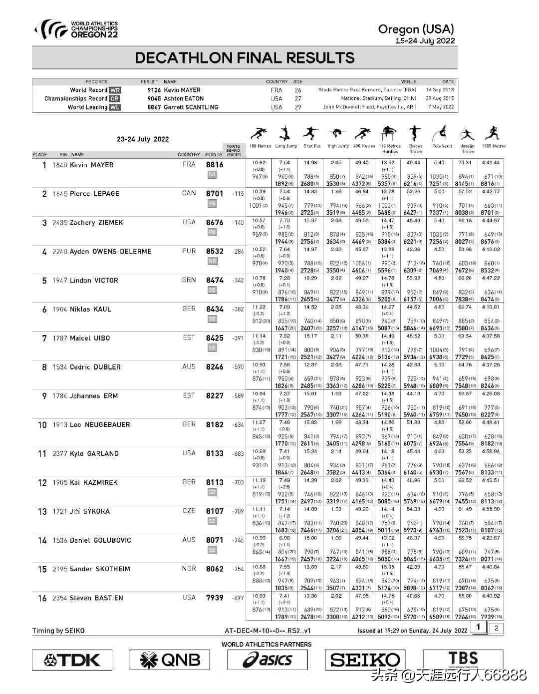 俄勒冈世界田径锦标赛男子十项全能,昨天加拿大华纳伤退,让9126分世界纪录拥有者法国梅耶尔少了一个强劲的竞争对手,前三名及成绩: