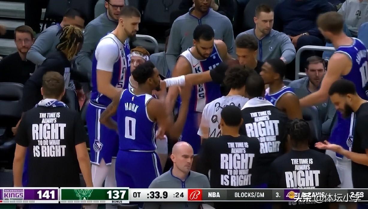 末节比赛,雄鹿状态依然出色,连续冲击内线拿分,巴恩斯打成2+1止血,波蒂斯三分命中,佩恩三分也进,比分来到105-95。国王主教练布朗突然暴怒,对着裁判怒喷,被直接驱逐,这一闹剧也将国王众将唤醒。许尔特三分命中,佩恩连续命中三分打进,可国王三分也接连命中,莱尔斯和小萨博尼斯打进,字母哥抢断扣进稳住局势,蒙克三分命中,福克斯中距离打进,蒙克两罚全中,分差只剩下1分。字母哥两罚全中,福克斯突破打进扳平比分,进入加时赛。