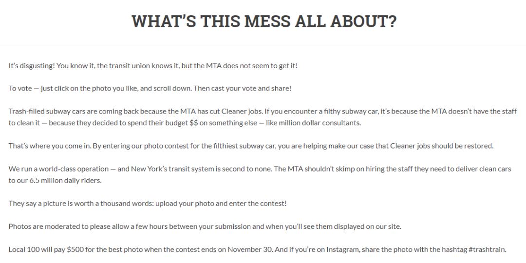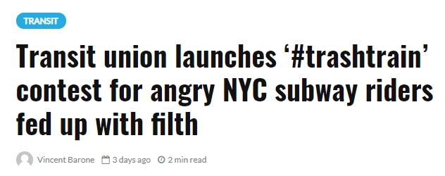 美东当地时间10月24日,据abc7ny,美国纽约工会“TWU Local 100” 为了抗议79名清洁员工被辞退,举办了一场名为“垃圾车厢”的摄影比赛,鼓励搭乘纽约地铁的民众将自己乘坐过最“脏乱差”的照片拍下来并上传至trashtrain.net网站上,就有机会获得500美金的头奖。