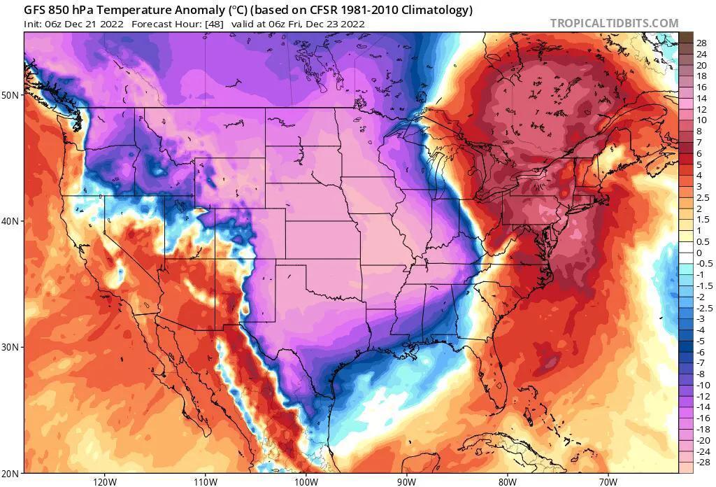 这次的寒潮早在12月中旬就已经被美国数值GFS和欧洲数值EC给预报出来,以GFS的预报为例,早在中旬的时候,GFS就预报出美国将迎全国性大寒潮,多地降温幅度可超过20度,冷暖变化极其剧烈。