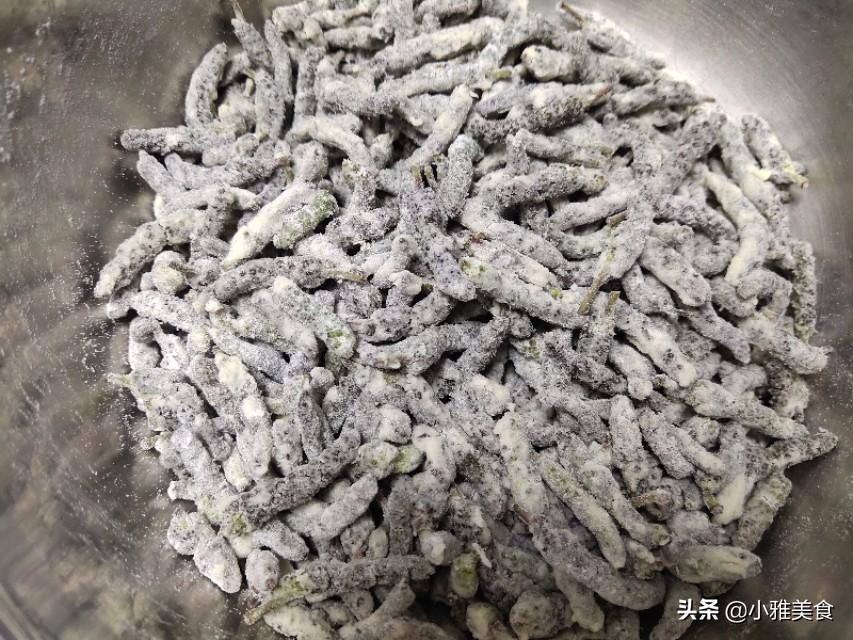 再加入面粉,边倒边将构树花抖一抖,让每一个构树花都均匀地裹上面粉。