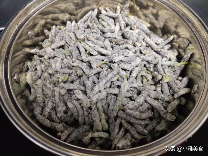 做蒸菜最重要的一点是,蒸出来的菜不能坨在一起,不能黏牙,吃在嘴里不能太软太烂,那样就吃不出野菜的鲜味了。