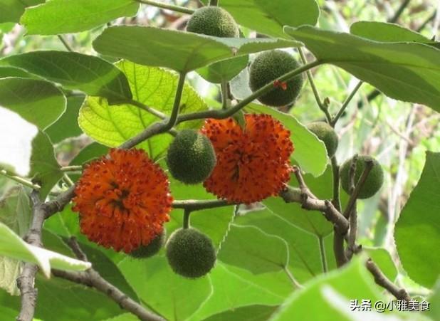 这种像构树花一样的食物,并不是树的果实,而是雄花。构树的雌花大家就更熟悉了,是橙红色的像乒乓球大小的圆形果子,水分饱满,清甜多汁,我小时候经常吃。