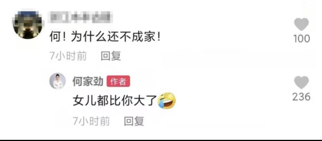 直至2021年11月,何家劲被网友公开催婚,何家劲便答道自己的女儿都比网友大了,顿时引发许多网友的热议,纷纷猜测他是不是隐婚生子。