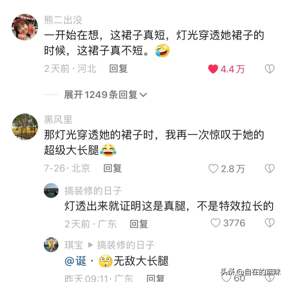 网友们纷纷留言表示惊讶,有的甚至开玩笑说关晓彤的腿需要上保险了。有些网友认为,关晓彤的身材真的很好,腿很长,身高也很高,让她看起来更加优雅和高贵。而另一些网友则认为,关晓彤的腿太长了,连腰都没有了,看起来有些不协调。