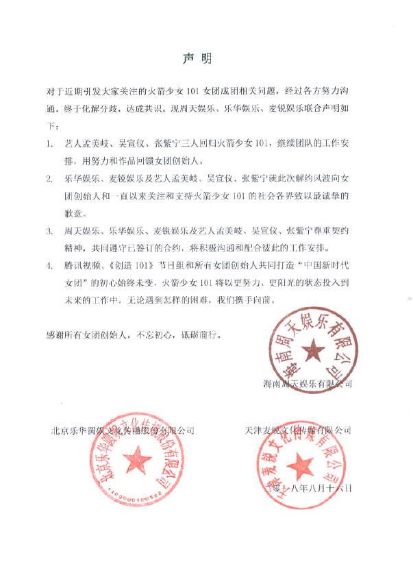 如今,事态的发展果如预料的一般(呃,可以说是马后炮),乐华、麦锐、周天(火箭少女101运营公司)三方终于达成共识,最终孟美岐、吴宣仪、张紫宁回归火箭少女101女团。说句题外话,孟美岐、吴宣仪在宇宙少女和火箭少女两者并行,孟美岐和吴宣仪在国内火成这样,回到宇宙少女估计人气和地位今非昔比了。