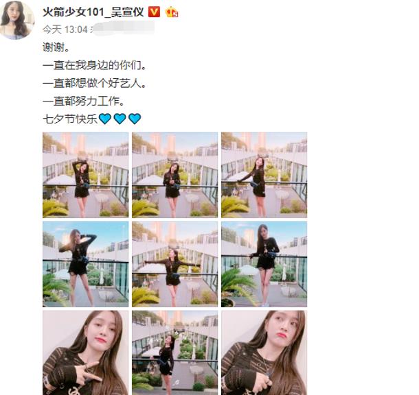 而然,就在七夕这个好日子事情出现了转机,乐华、麦锐与周天公司再次洽谈取得和解,孟美岐、吴宣仪、张紫宁回归火箭少女101,看到这个消息吴宣仪由心地在微博上写了“谢谢”俩字。吴宣仪还在微博里说了三句要感谢的,“一直在我身边的你们,一直都想做个好艺人,一直都努力工作”。看得出来,一个好的艺人,需要一群好的粉丝,和一个好的经纪公司,这样一直的努力才会迎来阳光。