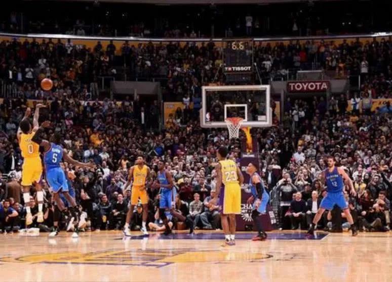 在与雷霆的一场比赛中,比赛还剩下10.5秒的时候,湖人108-109落后雷霆两分,最后时刻英格拉姆持球突破,被双人夹击,把球传给弧顶空位的队友,队友刚好要接球完成最后一投,谁曾想,半路杀出个杨大侠把球抢断了,完成了一个超远三分完成绝杀,队友都看呆了,要是投不进,得背多大的锅。