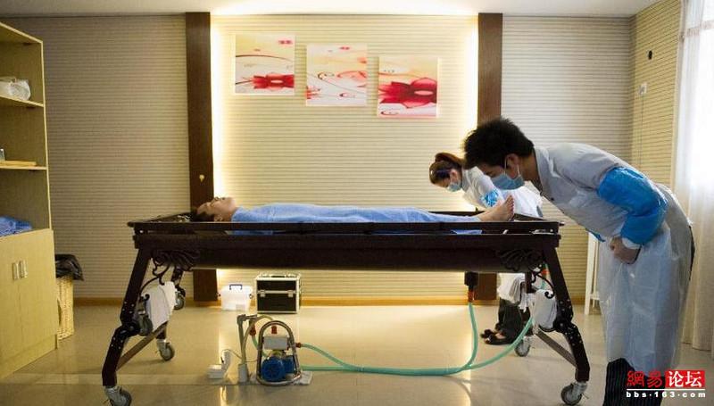 首先对“往生者”深深鞠躬,大概有一分钟时间,拉上帘子,把“往生者”搬上操作台。这个操作台是特制的,分两层,上面是特制的担架,下面是一个空的空间,像浴缸一样,一些管子穿过操作台底部,这是排水用的。