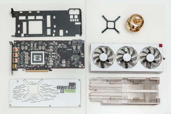 显卡的整体外观金属感还是很足的,导风罩和背板均为铝合金材质;模具与VEGA 64的限量版相同,但是表面处理从拉丝铝阳极改为了磨砂铝阳极。