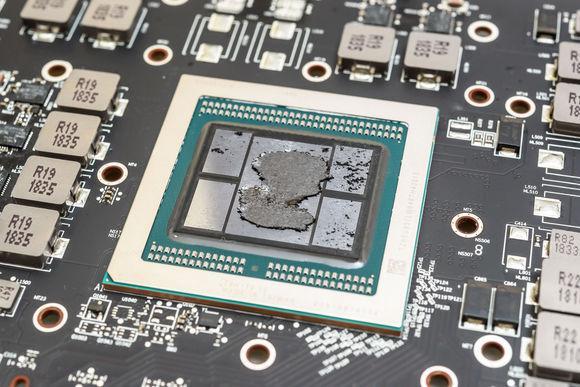 显卡的背板没有导热垫,只起到固定作用,可以看到背面有很多绝缘垫避免短路 ,显卡PCB中框背面做了大量导热垫,不过只针对于MOS管,供电PWM芯片没有做导热处理;需要注意的是核心的导热材料是比较特殊的,并非传统的硅脂,也不是液态金属。微距来看的话可以看到大量的分层结构,所以是石墨材料,导热效率会高于一般的硅脂;有一个细节我觉得做的还是不错的,就是显卡的散热鳍片几乎将风扇的空隙都填满尽可能增加散热面积;整个PCB的方案与VEGA系列较为近似,但是用料上明显有了增强。