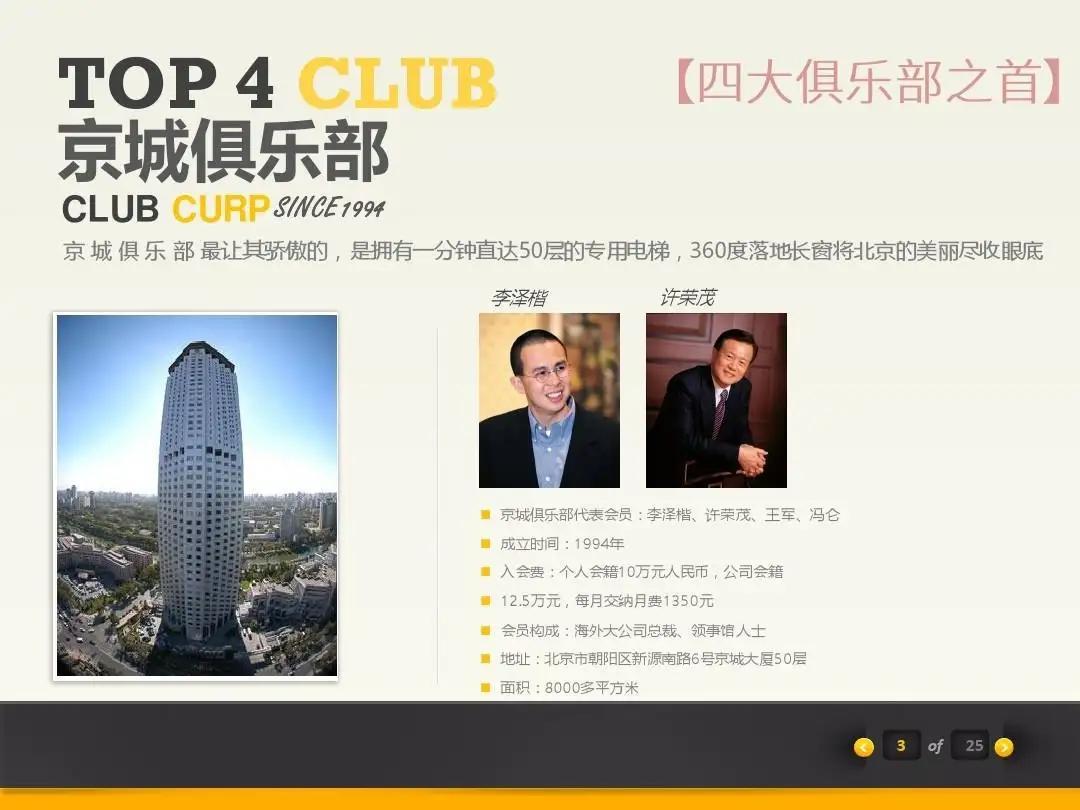 京城俱乐部位于北京亮马河畔京城大厦的顶层,于1994年10月由中国中信集团和美国国际会所管理集团共同创建,号称“中国第一富人俱乐部”。从开业以来,京城俱乐部始终是北京及周边地区最著名的,集会务、健身、餐饮、社交等多功能于一体的商务俱乐部,从京城大厦50层的位置鸟瞰,会员和他们的客人可欣赏到北京任何其它地方都无法比拟的360度环顾美景,尊贵感顿时油然而生。目前会员人数已超过1000人,云集了全球500强企业精英、新产业新贵和相当数量的驻华使领馆官员,包括潘石屹、许荣茂等一线社会名流。
