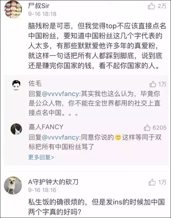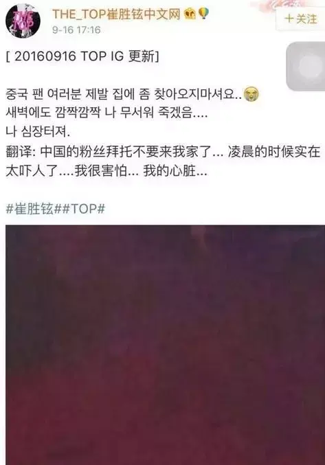 之前,TOP发ins称,在家受到中国私生饭的骚扰,直接开地图炮称“中国的粉丝拜托不要来我家了……”