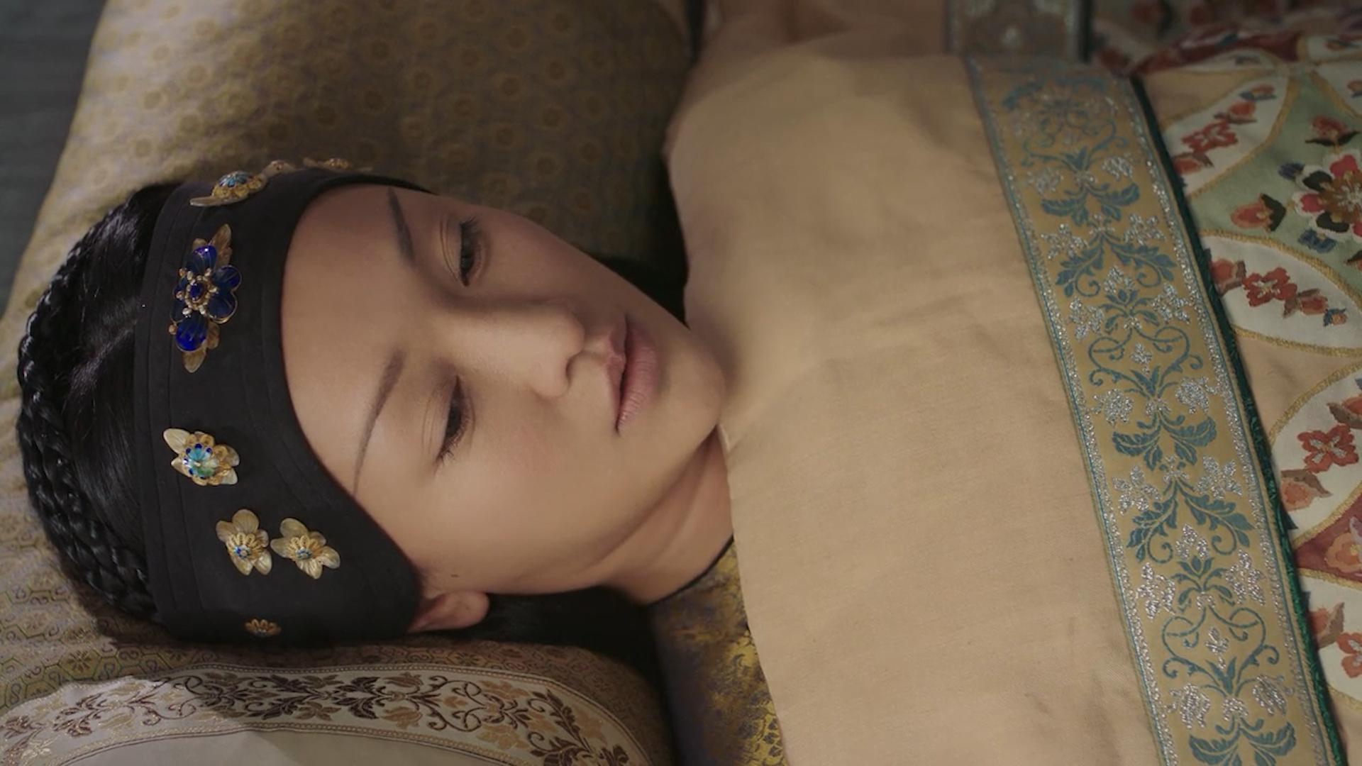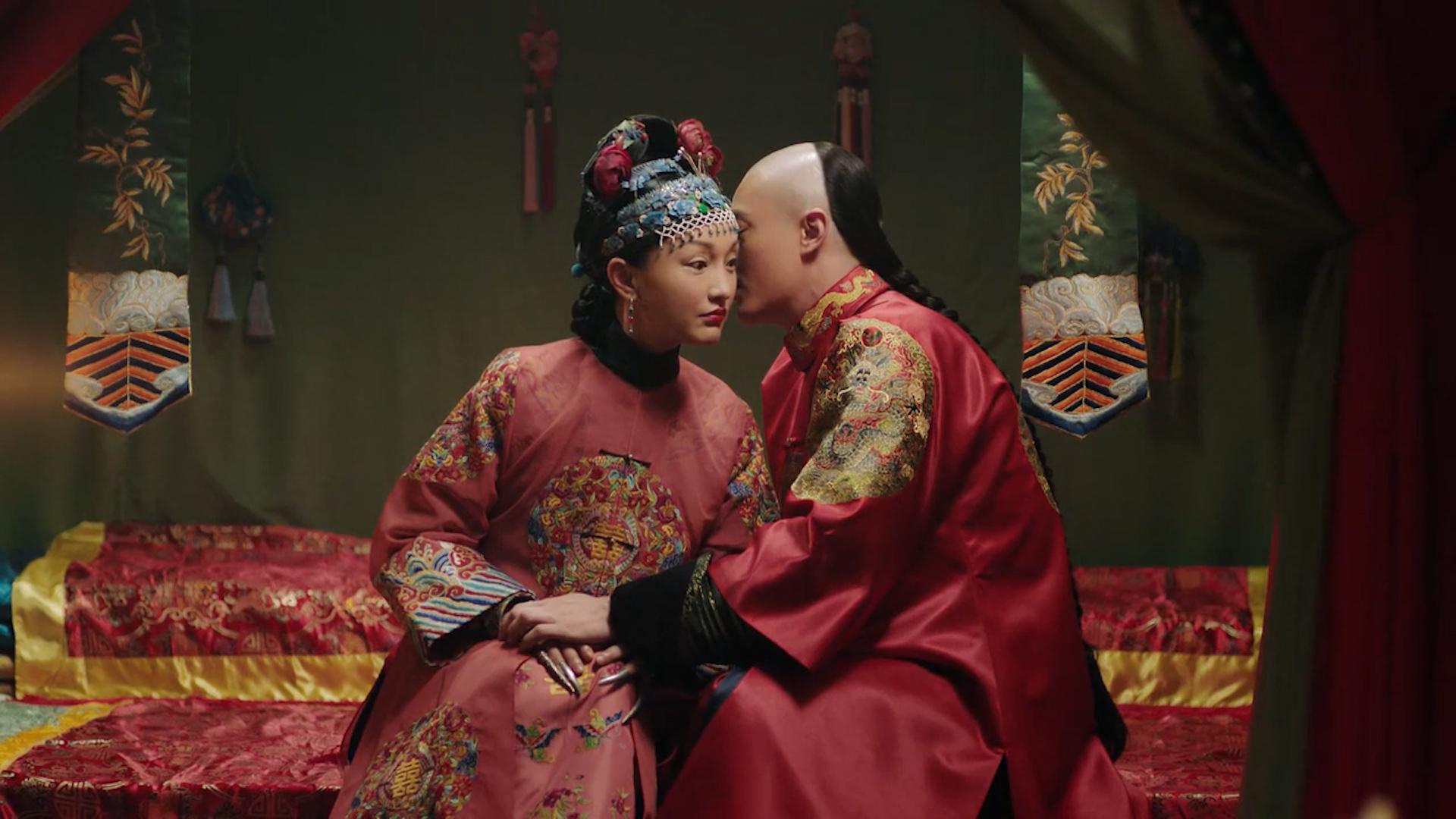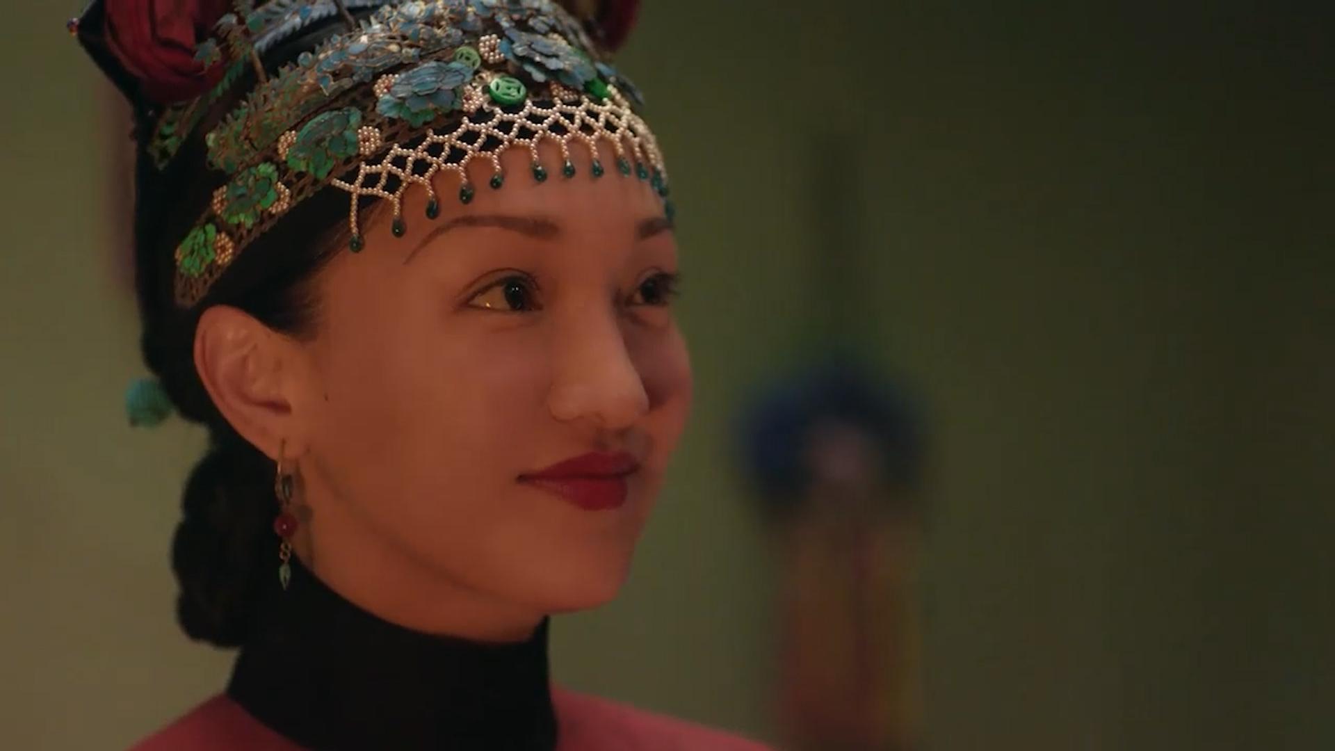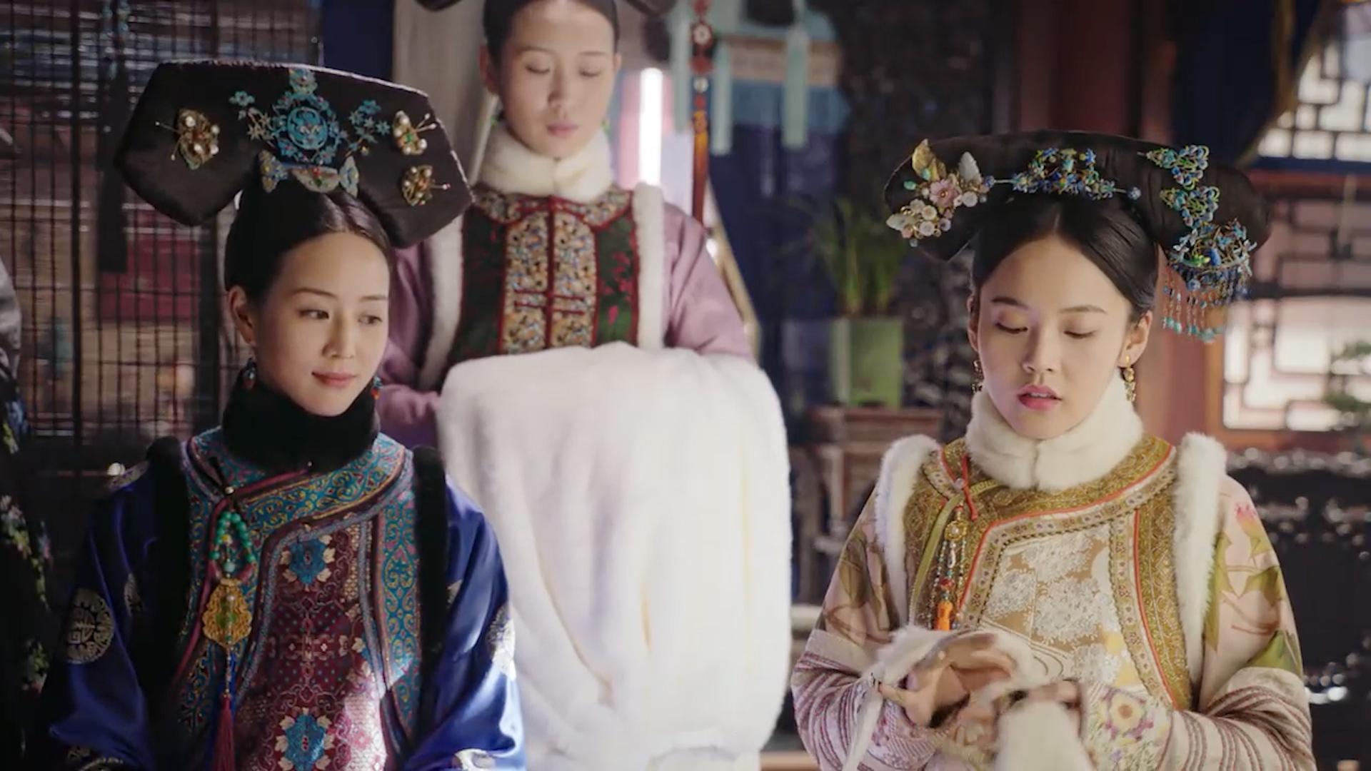 其实如懿不仅在生产后戴过抹额,大婚当天戴的也是抹额,头饰上方点翠,下方珍珠,那一抹由珍珠串联成的头帘确实精巧。