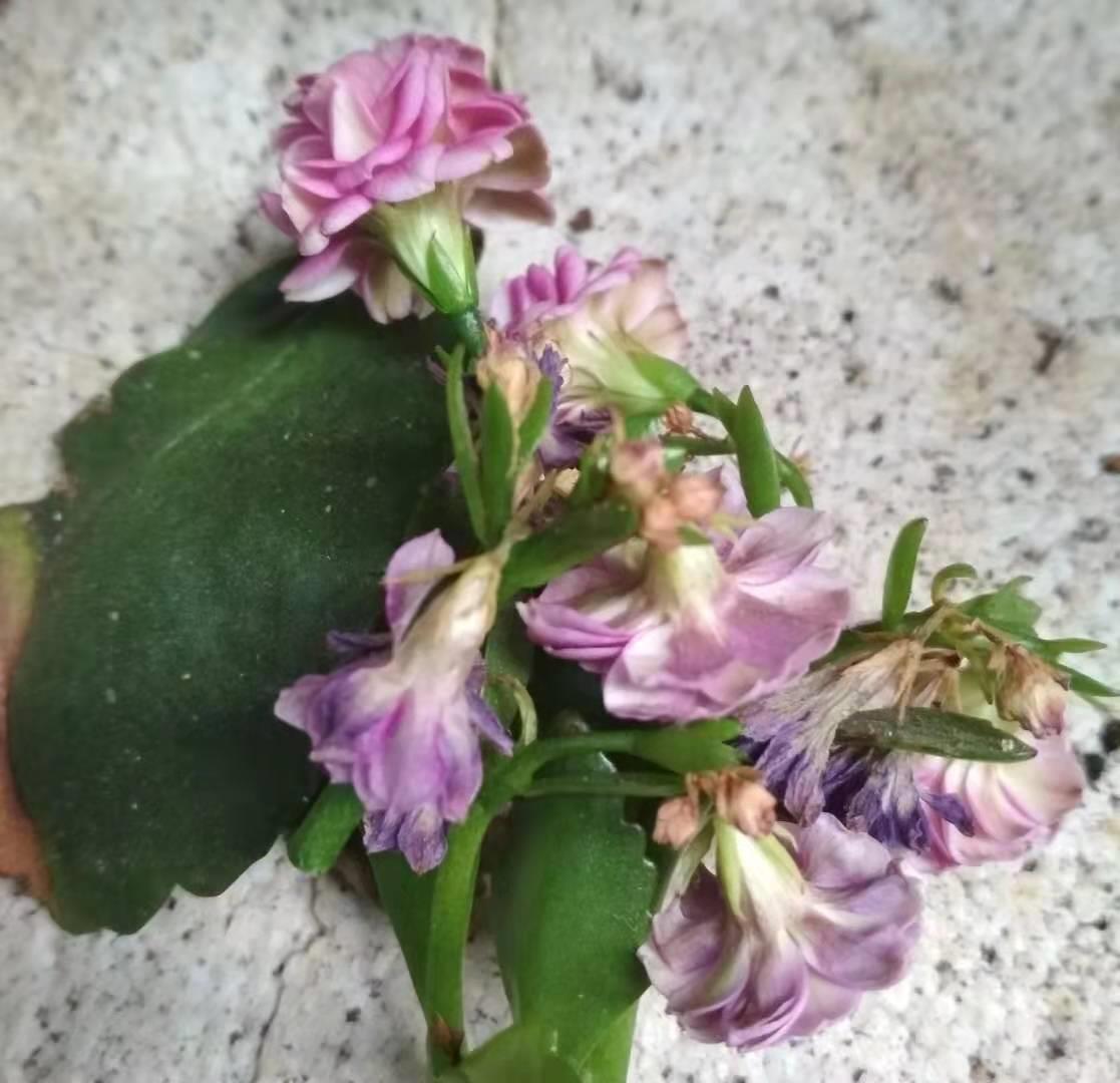 当长寿花的花朵颜色慢慢变淡,并且出现打蔫下垂的现象,证明它在慢慢的凋谢。这个时候我们就需要及时的对它进行修剪,将残败的花朵咔擦剪掉。