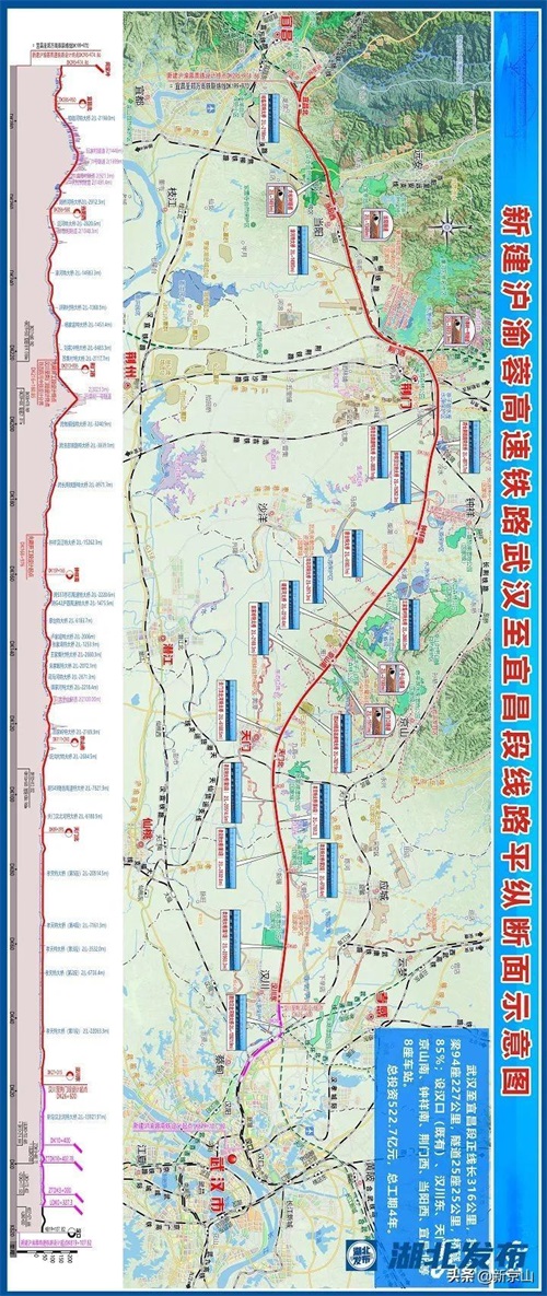 新建沪渝蓉沿江高铁绵延2000余公里,横贯东中西、连接6省市、串联3大城市群,是长江流域综合立体交通体系的主骨干、全国八纵八横高铁网的主动脉。设计速度为350公里/小时,建设工期4年。线路起自汉口站,经汉川、天门、钟祥、荆门至宜昌,接入宜昌至郑万高铁联络线闵家冲线路所,新建线路长295.9公里。全线设汉口(既有)、汉川东、天门北、京山南、钟祥南、荆门西、当阳西、宜昌北8座车站。该项目对我省构建“米字型、十通向”高铁枢纽网,加快“建成支点、走在前列、谱写新篇”,更好服务和融入新发展格局,具有重要意义。