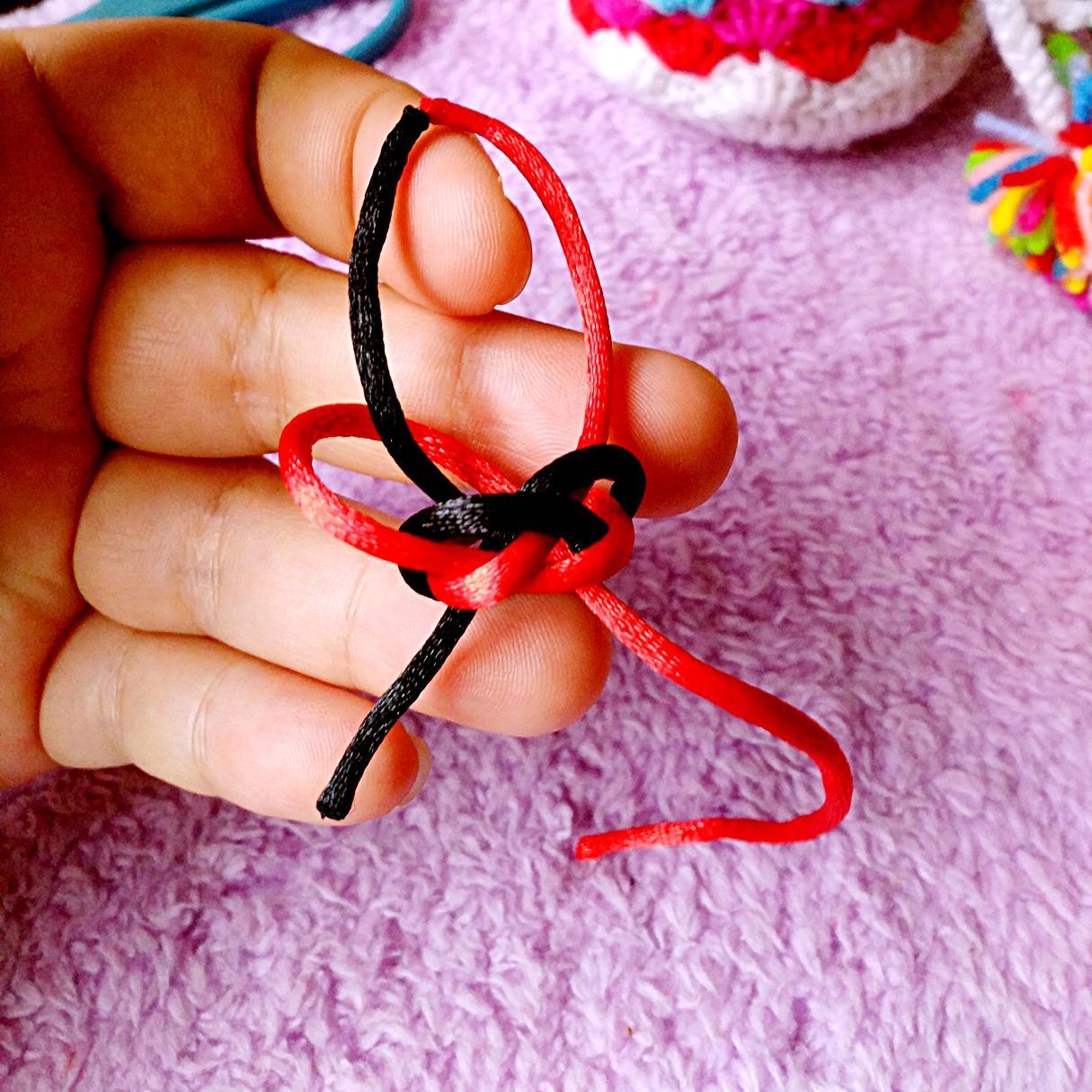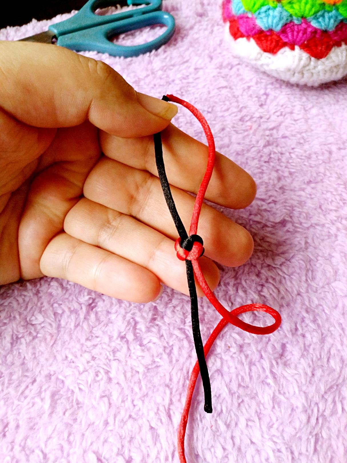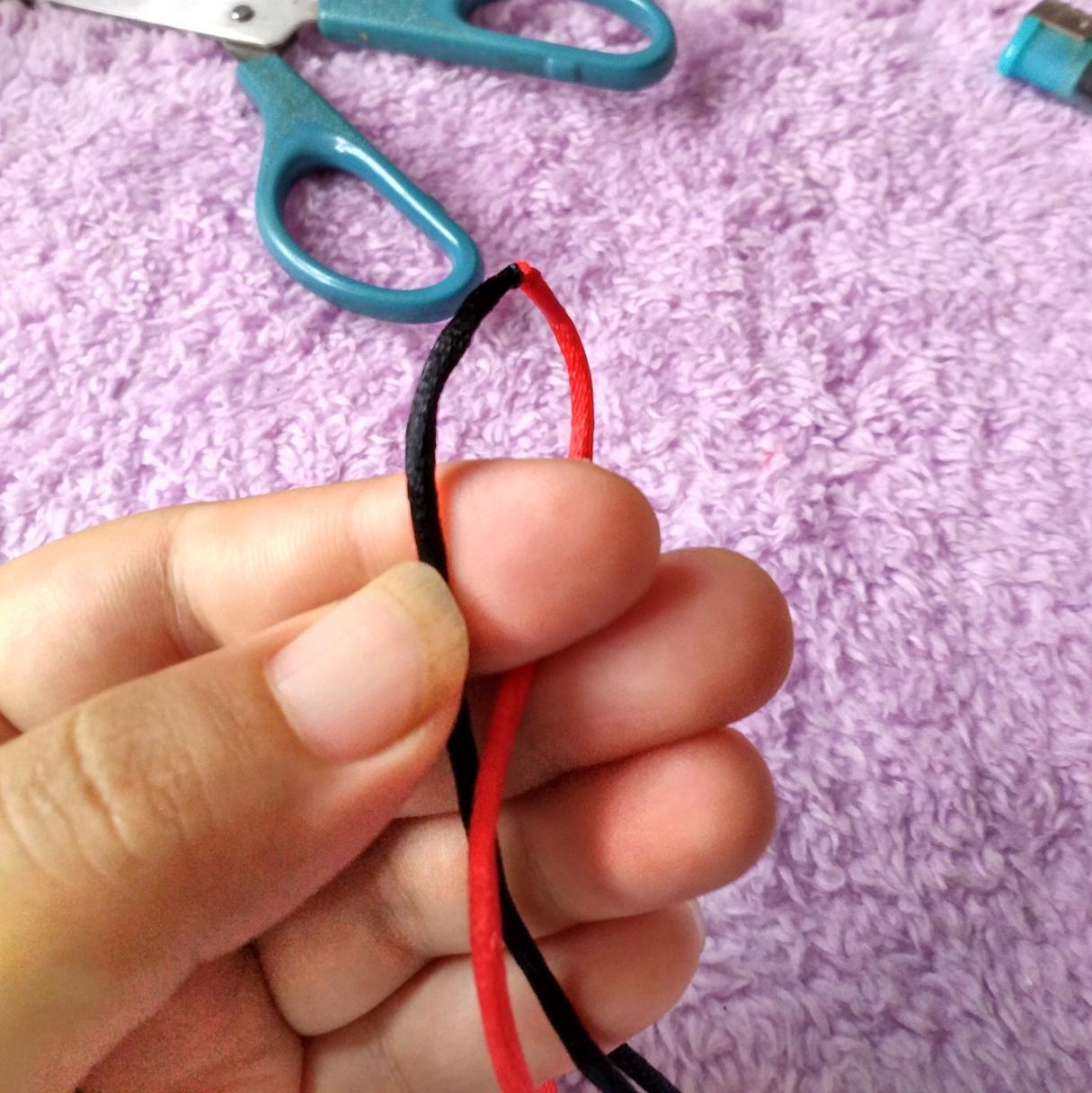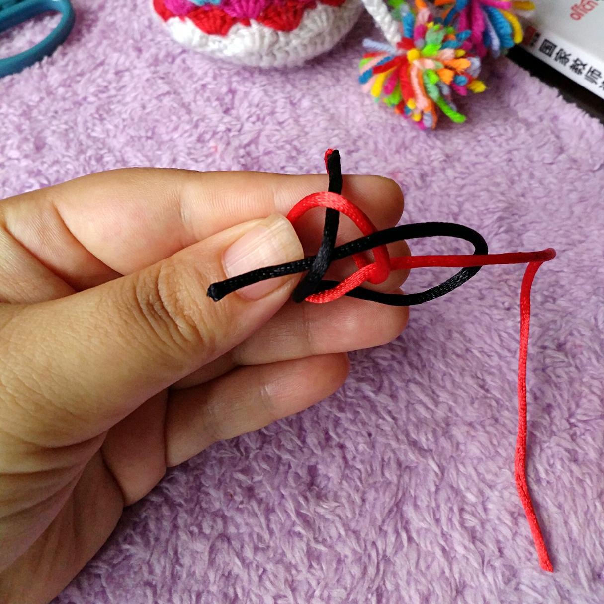 5、黑线从红线下方绕过(黑线剪短了,大家可以留长一点,方便学习)