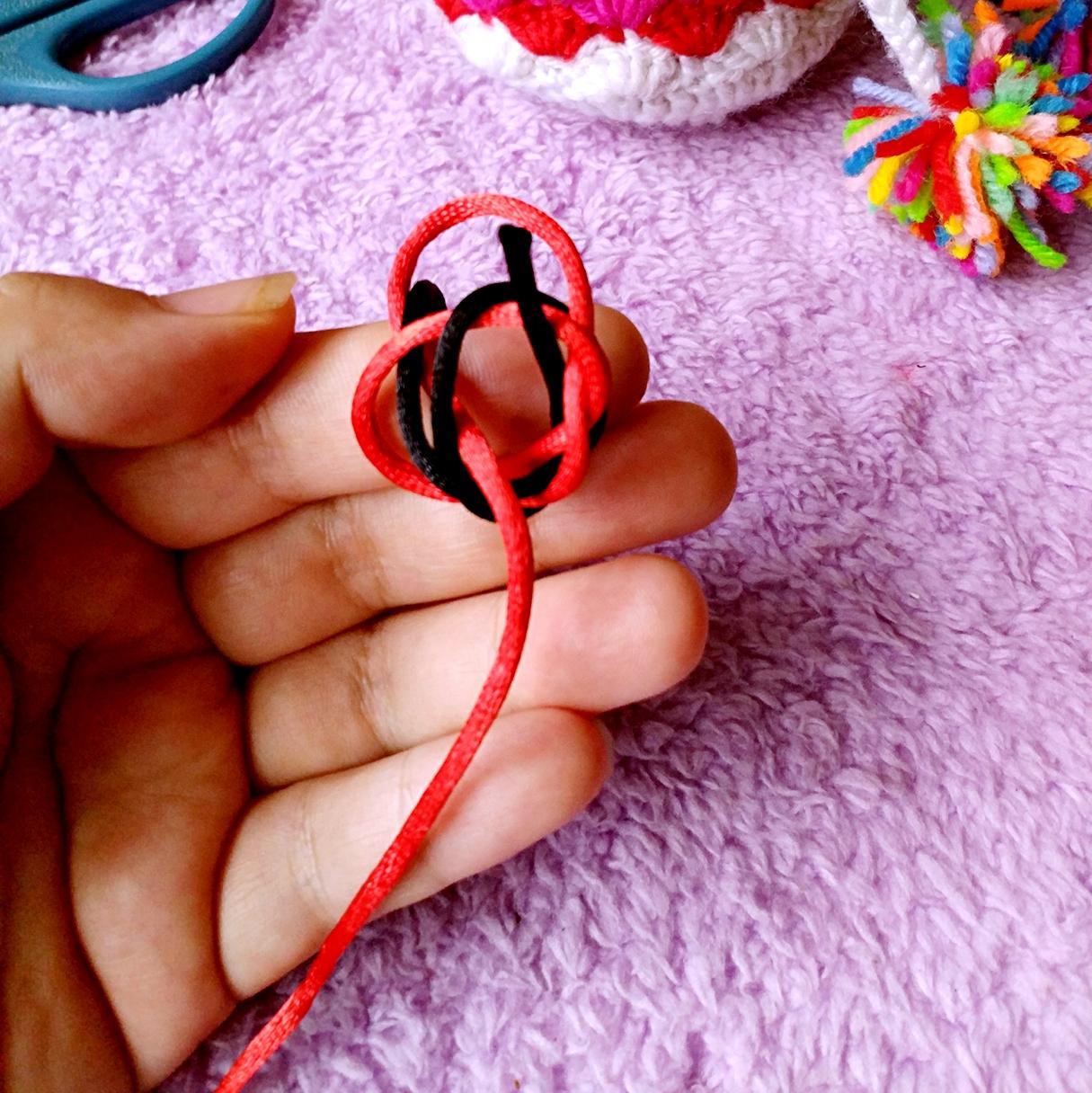 3、黑线从红线下方绕过,压在红线圈的右边顺势从圈里的黑线下穿过