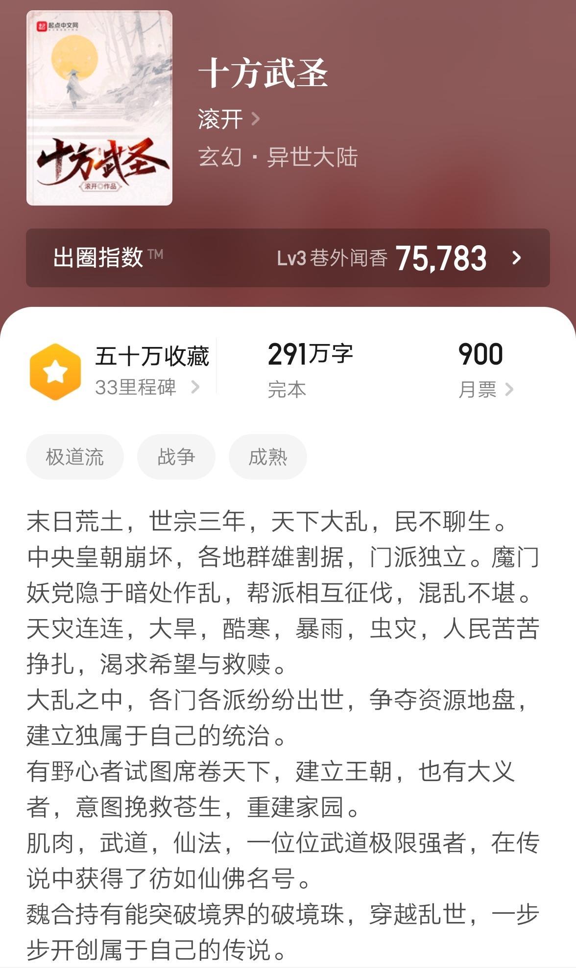 只能说,大神之后,滚开的几本小说都成绩平平,没有太大的跨超。尤其是《万千之心》在创作上并没有实现超越以往的突破。那么到了《十方武圣》,滚开能不能等来久违的白金称号呢?