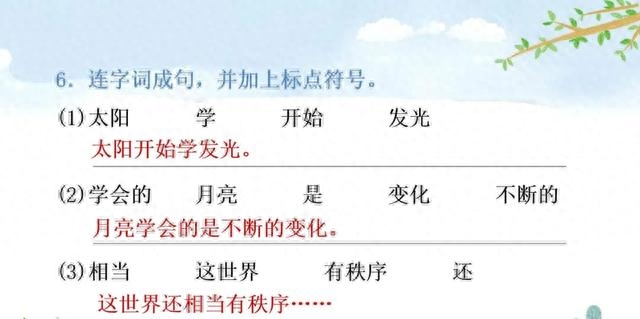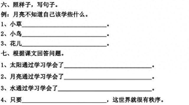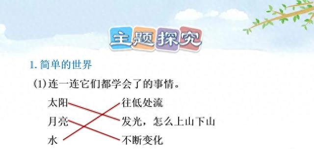 太阳发光,每天东升西落;月亮有时圆,有时缺,不断变化;水一直往低处流。太阳给世界带来了光明和温暖;月亮的圆缺变化帮助人们计量时间;水滋润万物,帮助万物生长。它们都做着自己最容易做的事,让这个世界很有秩序,很美好。