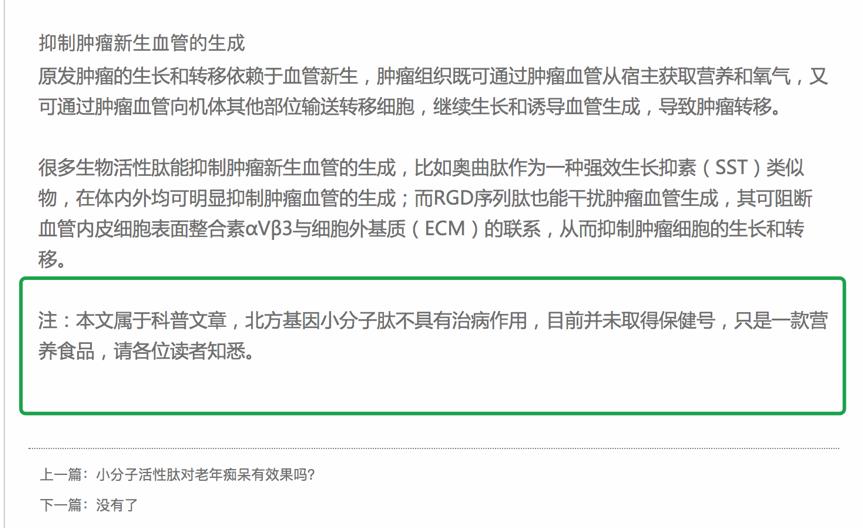 网上提到北方基因官网存在小分子肽的暗示性宣传文章,小编也进行了查看,的确有,但是涉及小分子肽的文章在文章底部都注明了一段话“注:本文属于科普文章,北方基因小分子肽不具有治病作用,目前并未取得保健号,只是一款营养食品,请各位读者知悉。