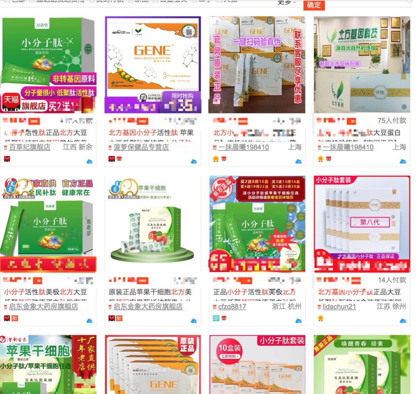 接着小编又去马云爸爸和小强叔叔这样的大平台查了一下,北方基因小分子肽产品不但存在,还很多,购买者也不少,为避免涉嫌打广告,小编加了部分水印,感兴趣的大家可以自行了解。