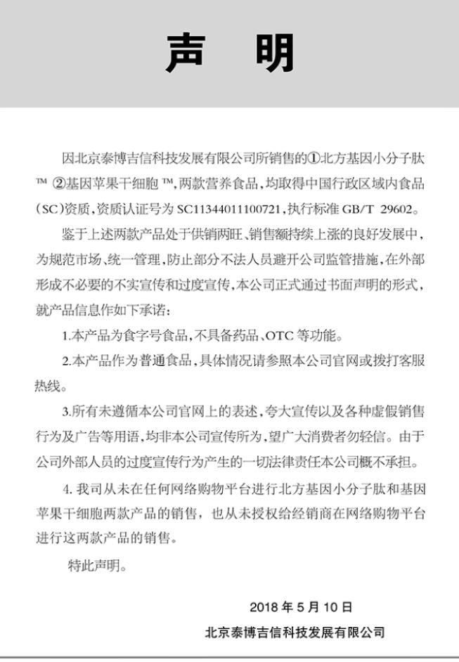那么北方基因小分子肽是否存在虚假宣传呢?从其官网我们找到一则声明,在该声明中北方基因澄清其旗下小分子产品只是一款食字号产品,不具备药效功能,同时也在谴责夸大宣传的行为,为此,小编觉得应该给北方基因点个赞。