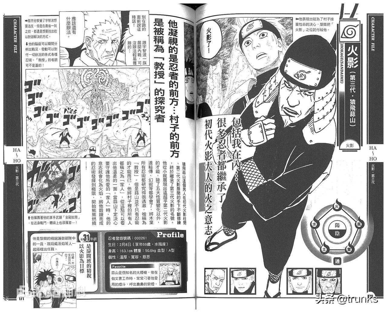 第三代火影猿飞日斩的台词——有树叶飞舞的地方,火就会生生不息!这也是三代目火影终其一生信奉、坚守的信条。猿飞老师能够自如使用五种查克拉属性,精通木叶所有忍术,享有“忍术教授”的称号。培育出了威震忍界的“三忍”。