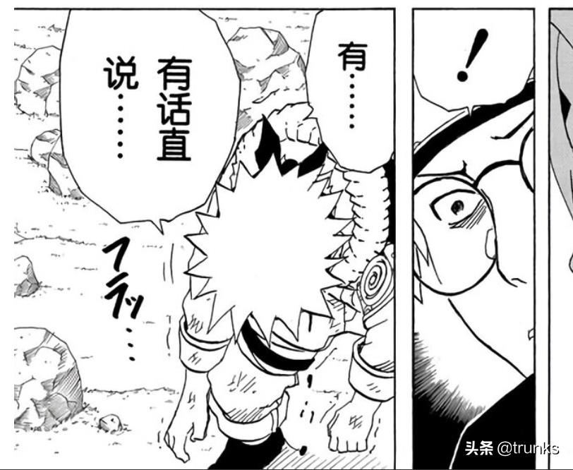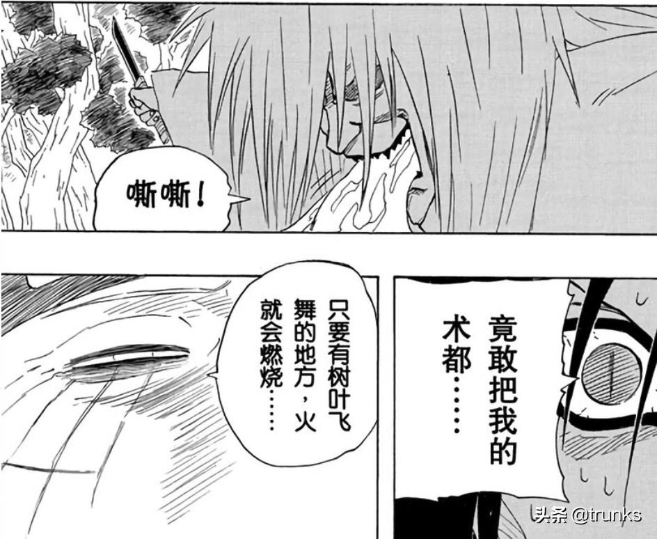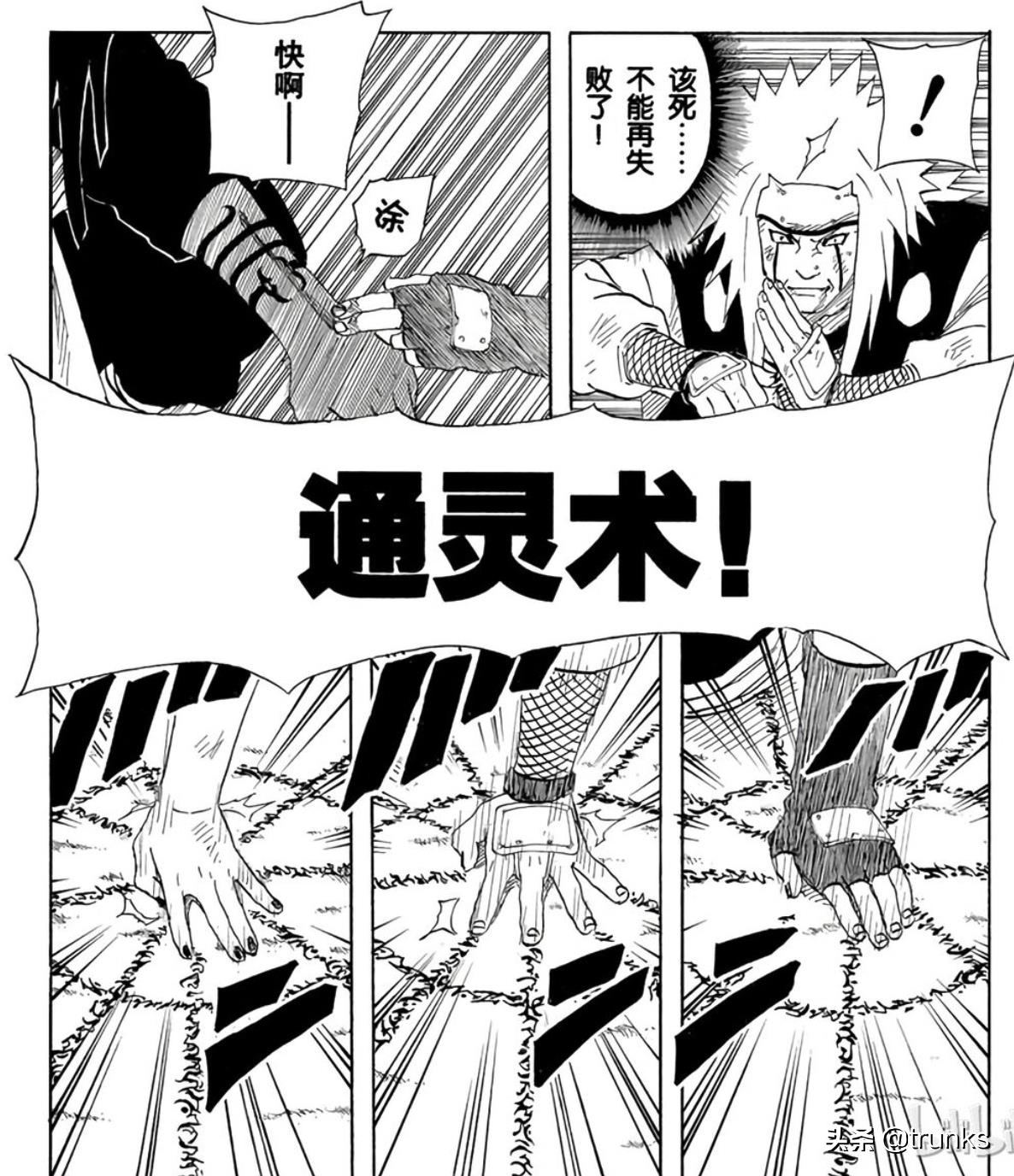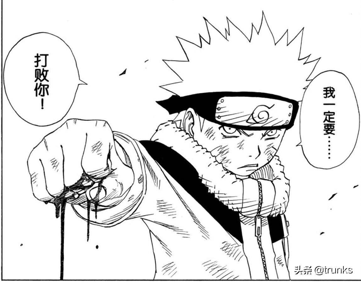 另一处比较经典的出处,来自自来也、大蛇丸、纲手三人的巅峰对决。纲手因为恐血症导致不敢继续作战,而自来也又被纲手下了药发挥不出真正的水平。鸣人为了守护村子、守护火的意志奋勇向前,被兜打得七荤八素的。
