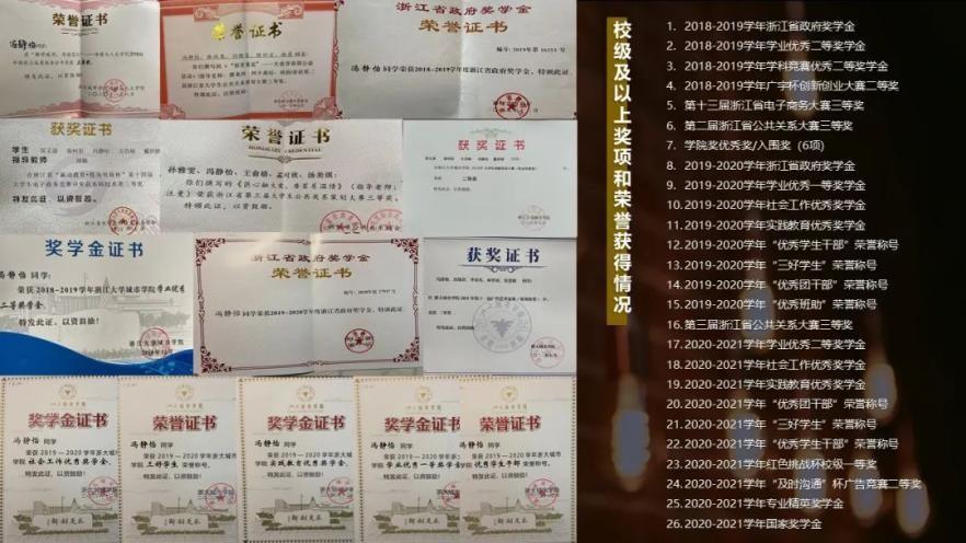 在冯静怡眼里,日常学习和参加比赛是一个相辅相成的过程:“参加比赛能让我知道自己和别人的差距在哪里,从而给自己更高的要求。”在努力和奋进的双重加持下,冯静怡曾获浙江省第十四届大学生电子商务竞赛本科技术组三等奖、两次浙江省大学生公共关系策划大赛三等奖等多个竞赛奖项。