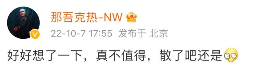 对线完锐评自己新歌的UP主后,那吾克热转头又做了删除重新发布了一句话总结就是“不值得”。