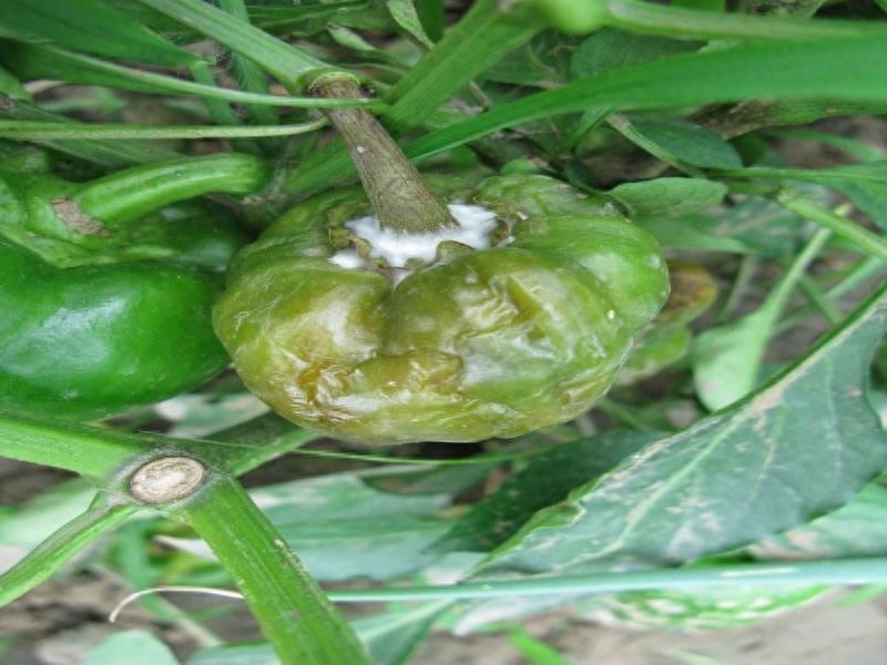 辣椒软腐病是一种主要为害果实的疾病。病果初生水浸状暗绿色斑,后变褐软腐,具恶臭味,内部果肉腐烂,果皮变白,整个果实失水后干缩,挂在枝蔓上,稍遇外力即脱落。