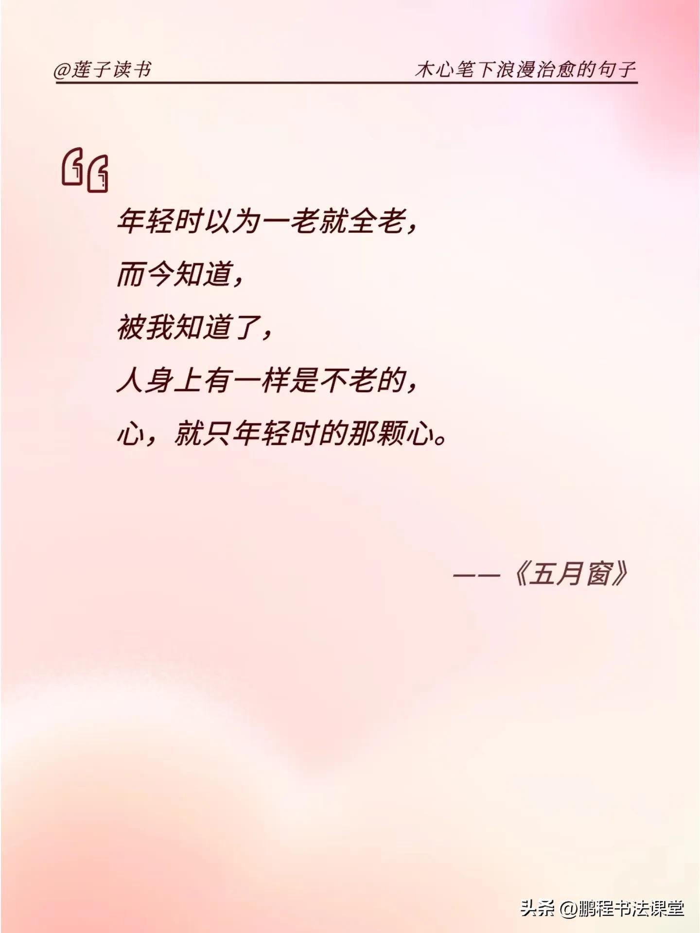 年轻时以为一老就全老, 而今知道,被我知道了, 人身上有一样是不老的, 心,就只年轻时的那颗心。 ——《五月窗》
